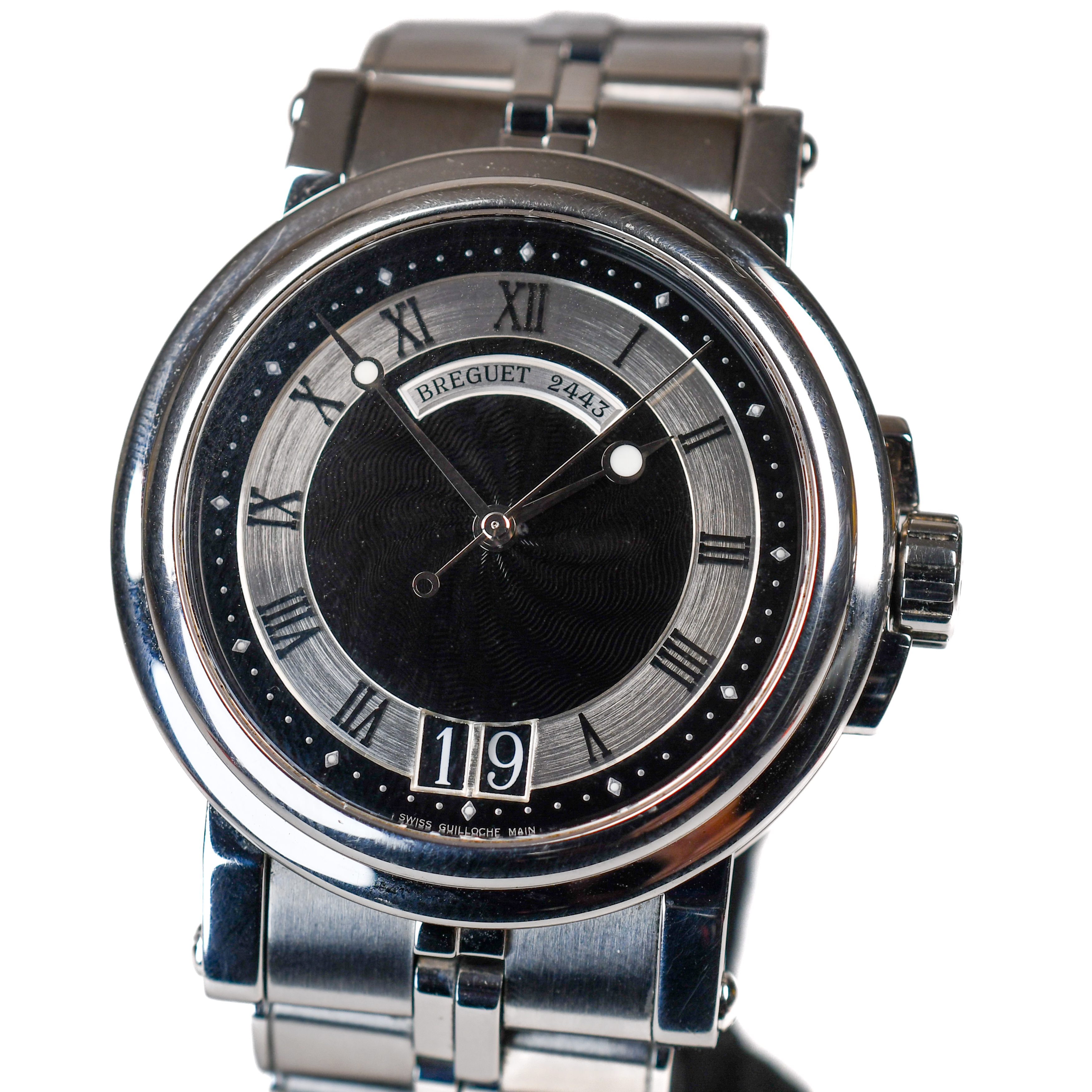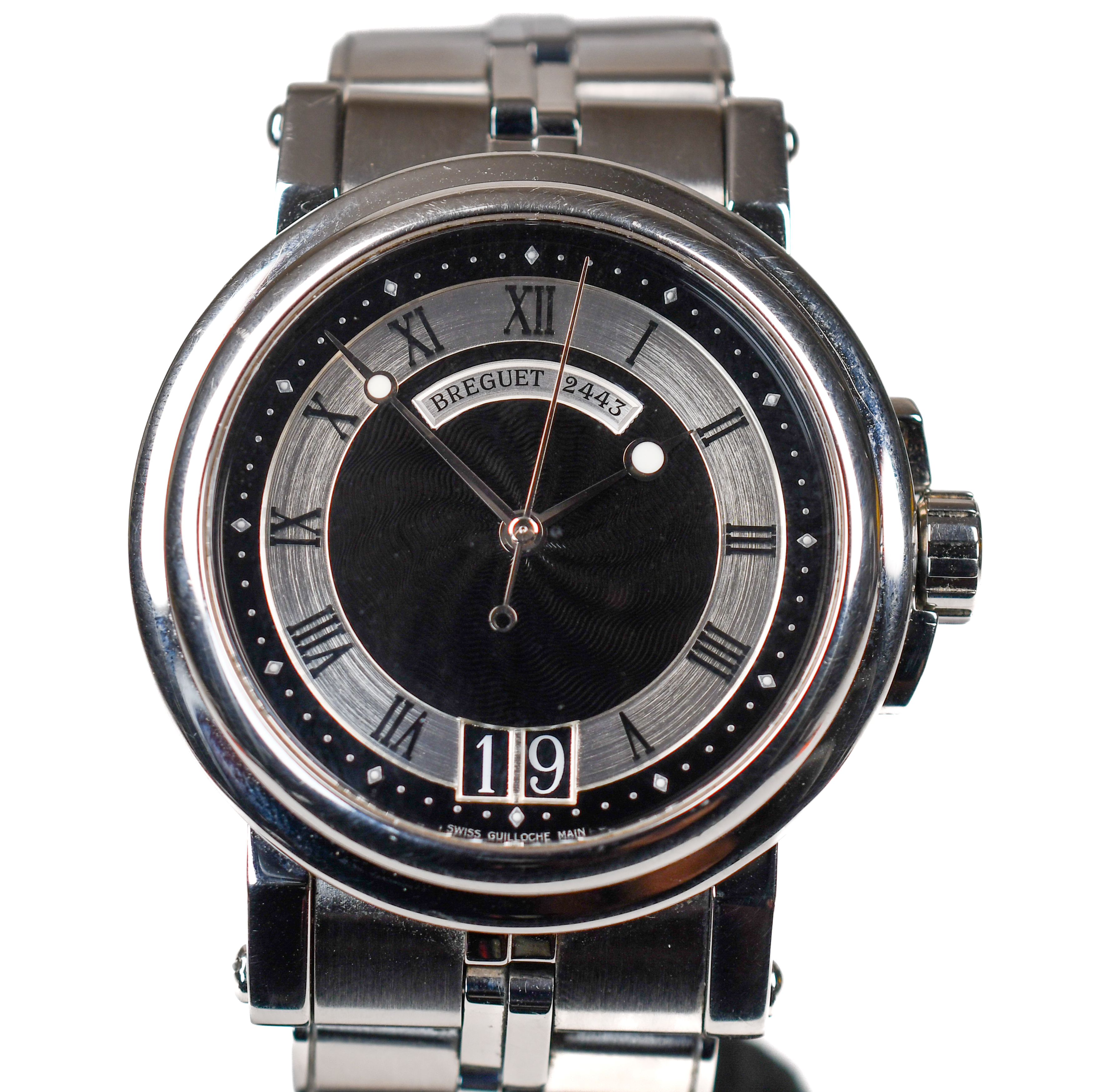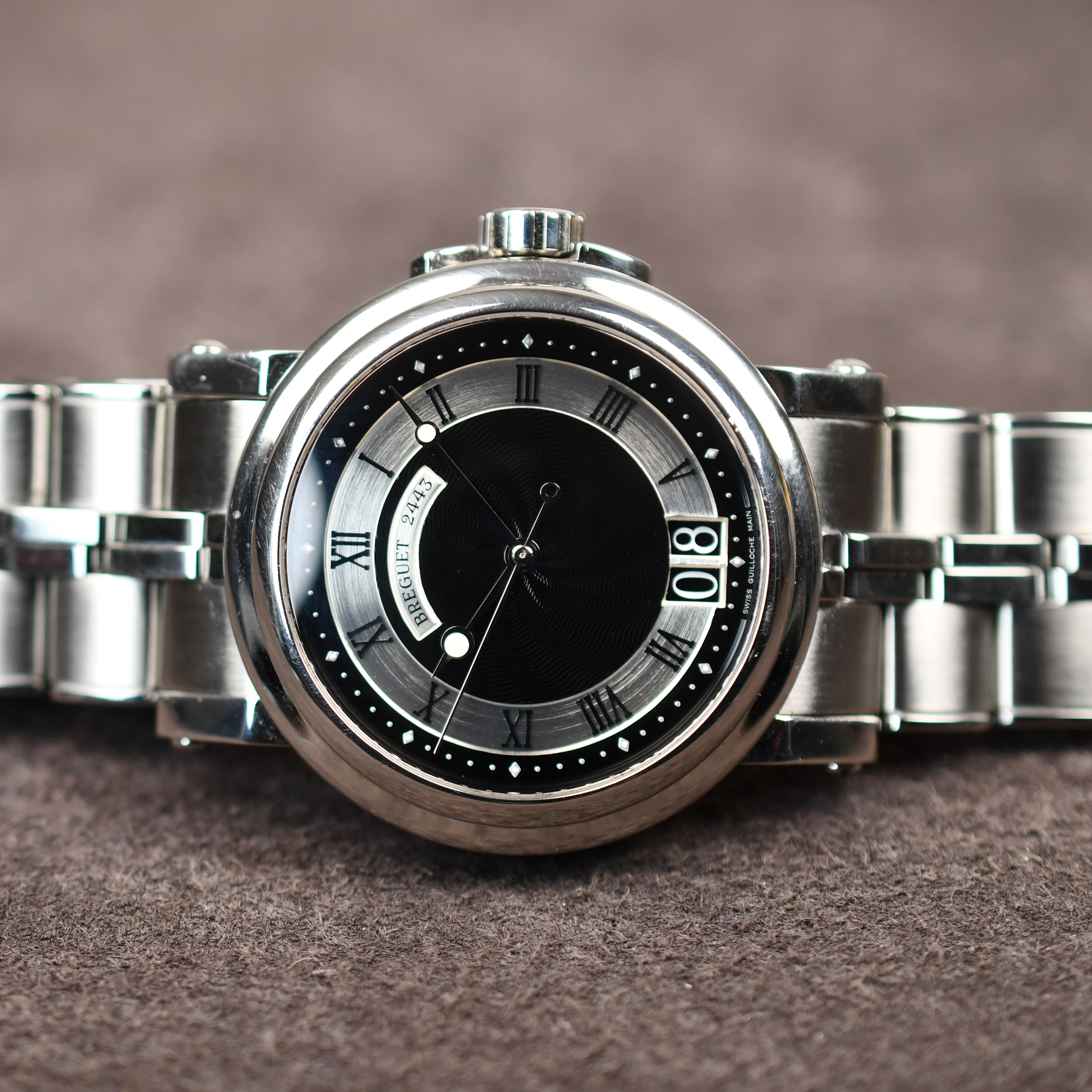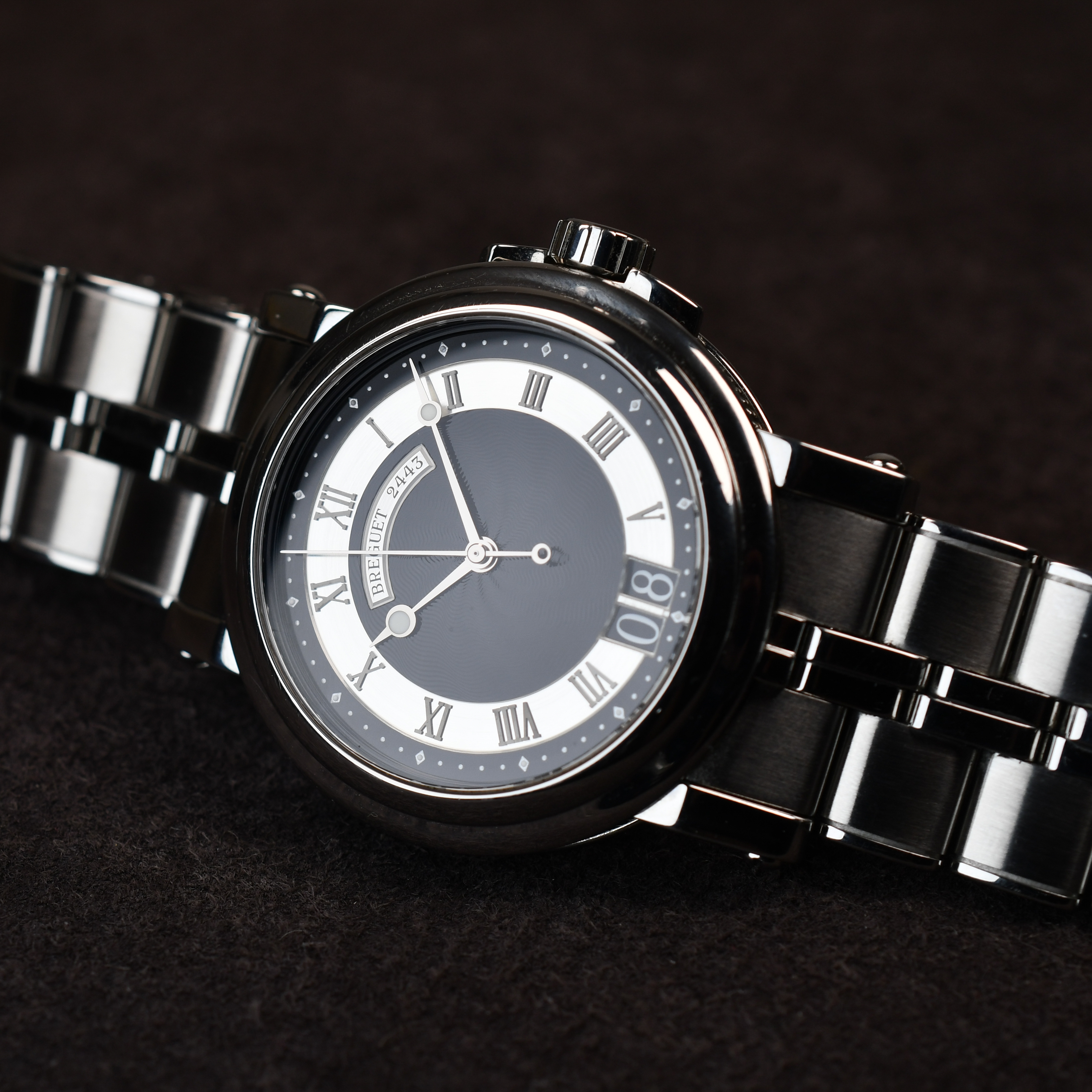 For auction is a Breguet Marine 5817ST/92/SV0 Black Dial Big Date service papers. The Good: 1. The Marine Big Date is a modern classic; one of the best modern Breguet and a watch that works great for sport or dress, the black dial especially so. 2. Comes on the desirable bracelet which really changes the whole feel of this watch. 3. Had a service by Breguet in 2021 and working/functioning correctly, -3 seconds per day and +278 amplitude. The bad: 1. No original box or papers just a service box and card. 2. Bracelet will only fit up to a 7.1" wrist.