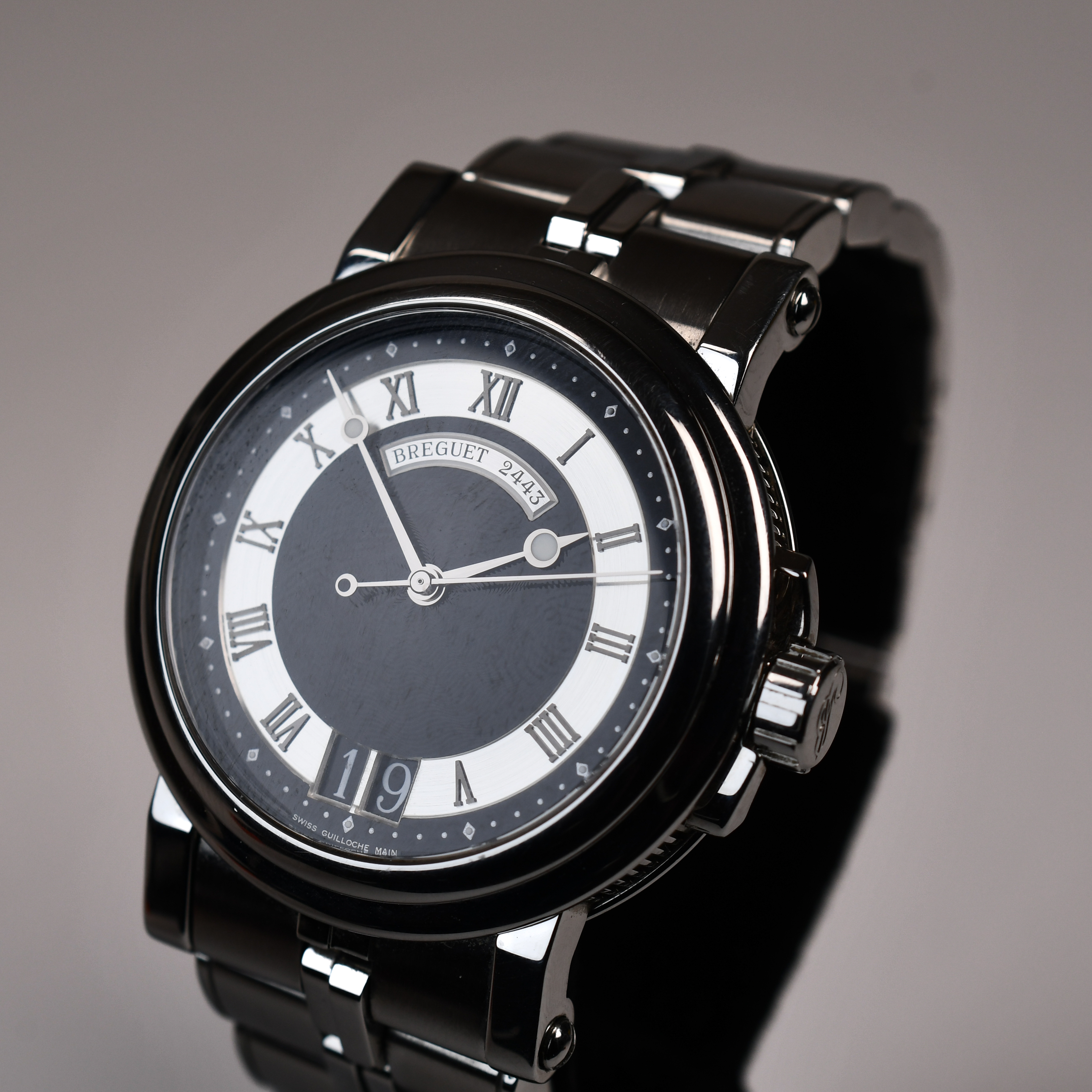 Dial: Black guilloche dial and Breguet hands, silver track with applied Roman numerals, big date at 6 o'clock