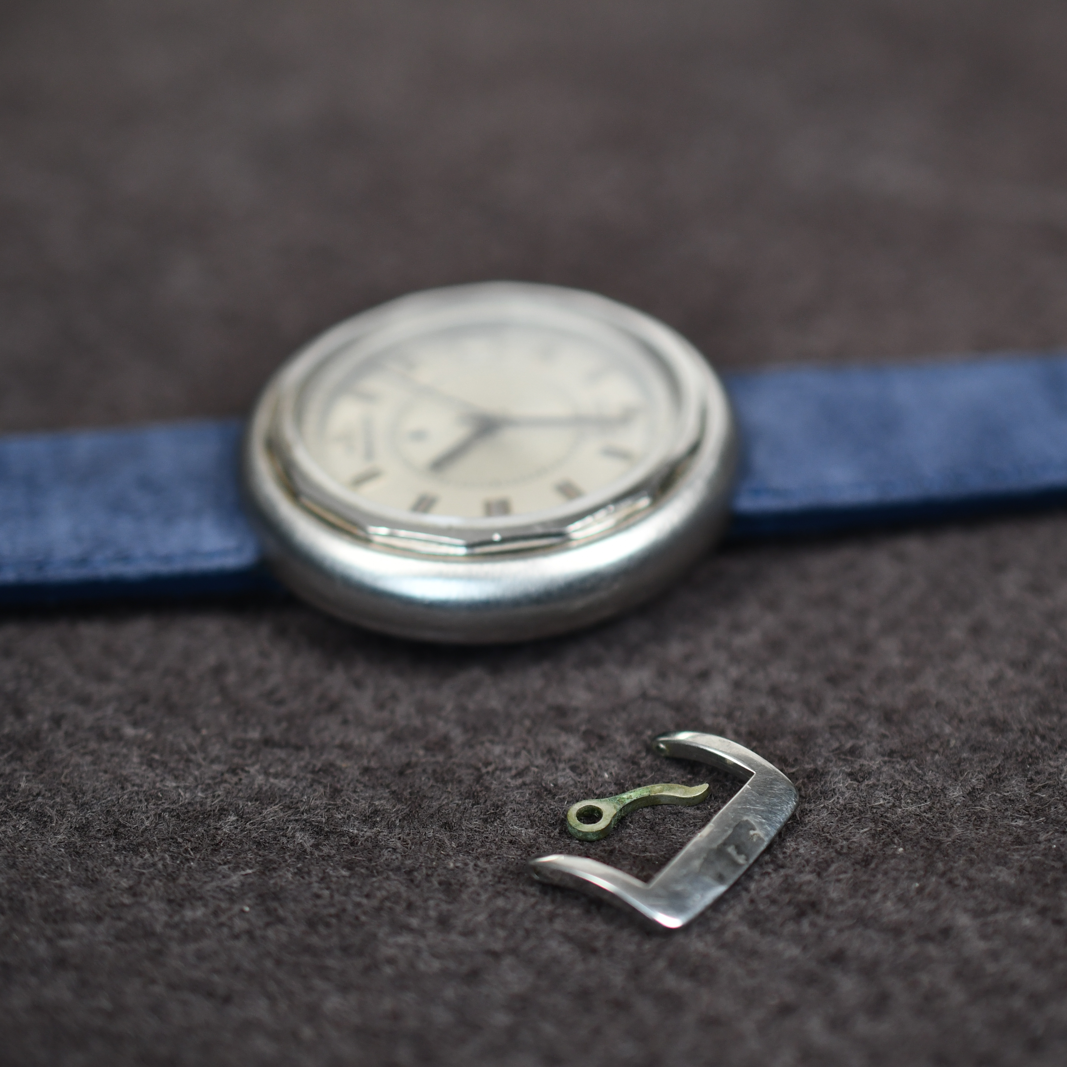 Dial: Silver with applied baton markers, a light mark on the inner chapter around 6 o'clock and some age related marks on the outer chapter.
