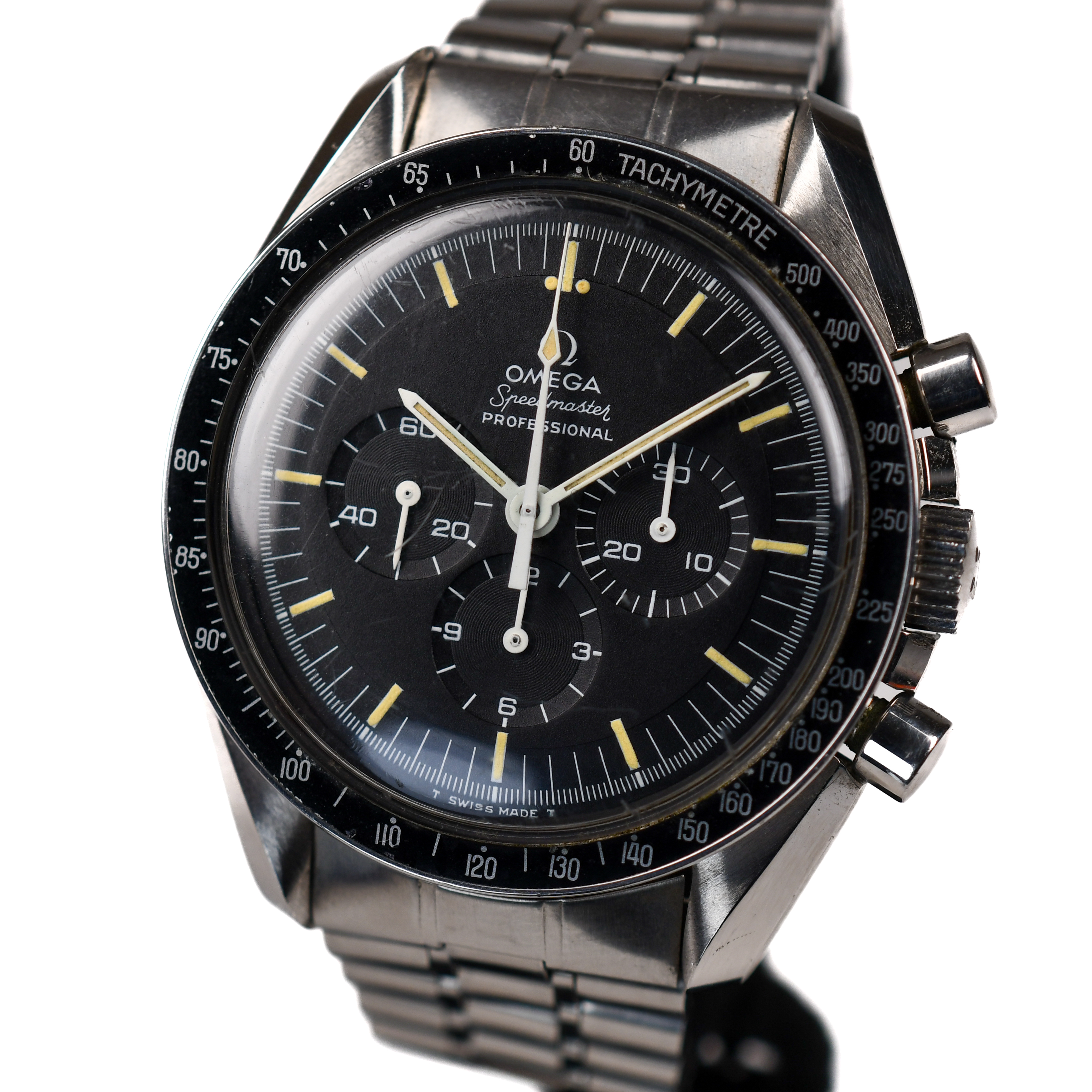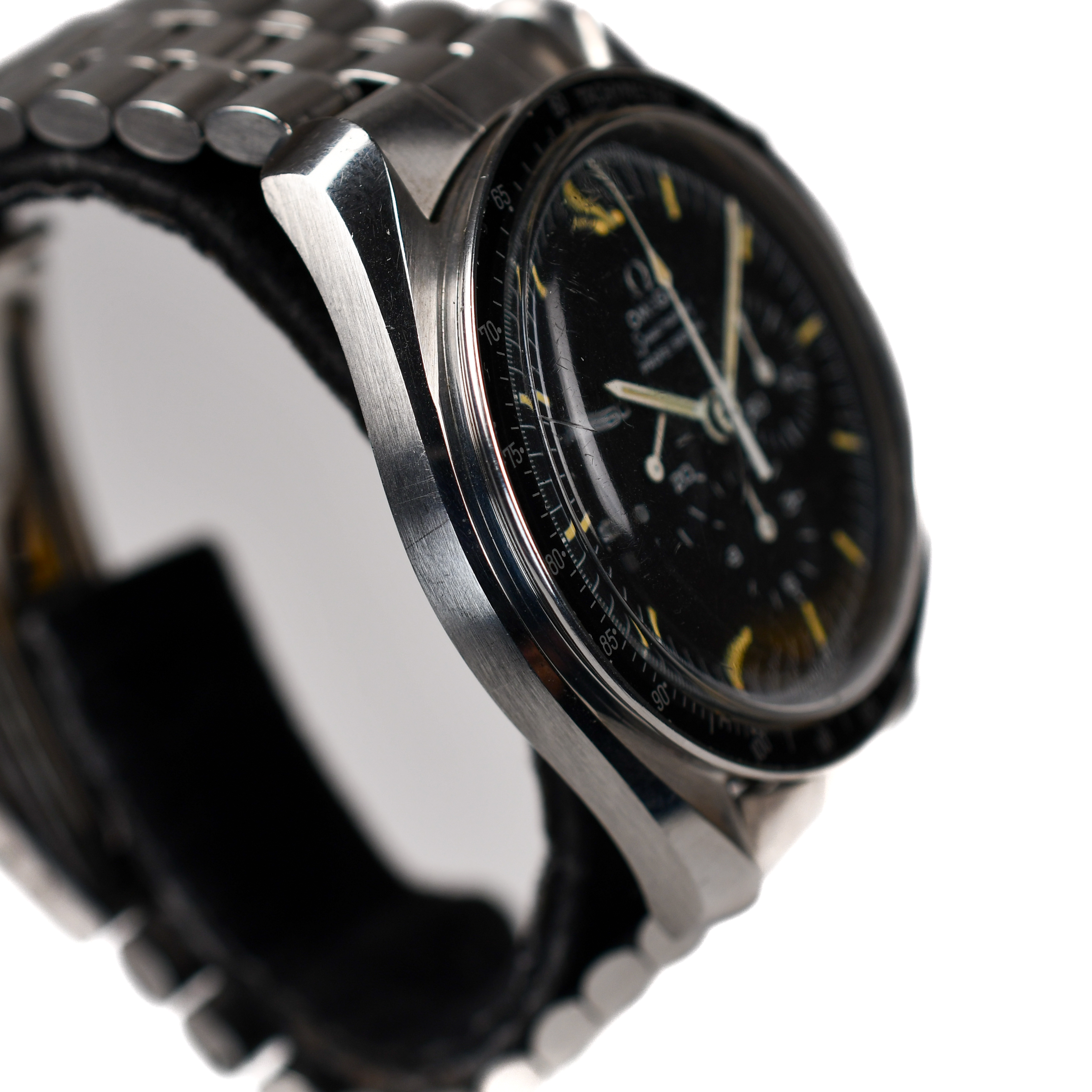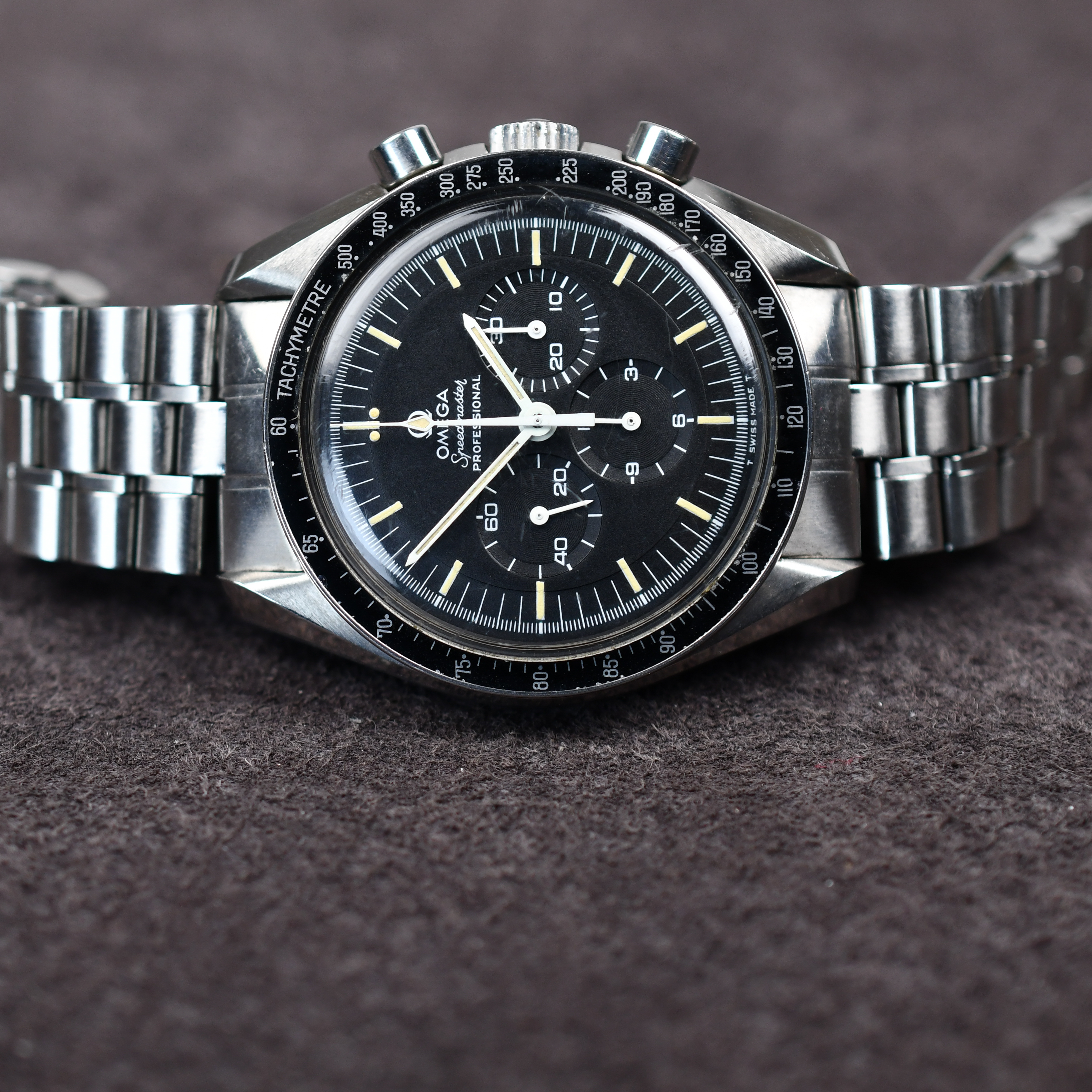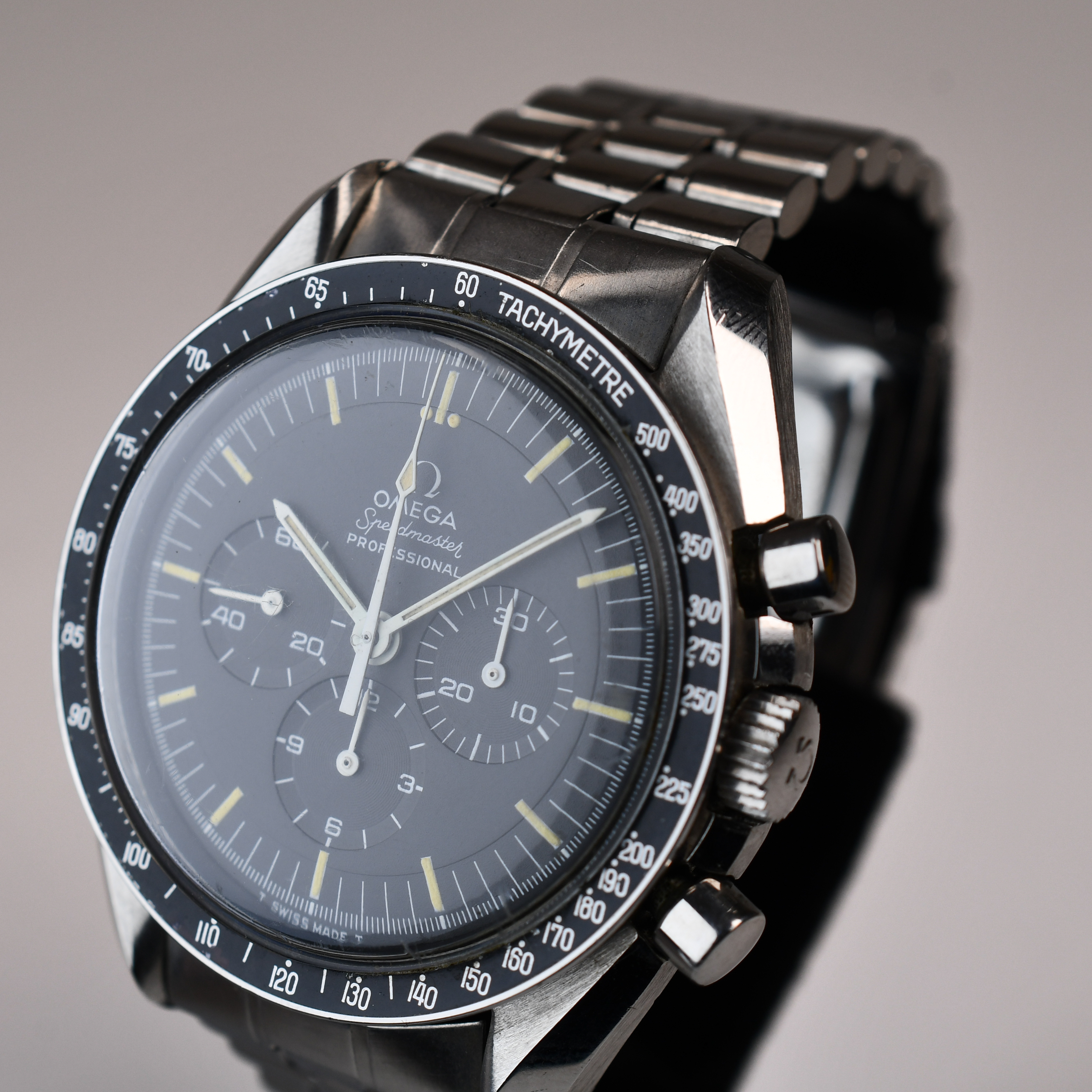 For auction is a very rare 1970 Omega Speedmaster Professional 145.022-69 Apollo XI Straight Writing in exceptional condition on 1116 bracelet. The Good: 1. Condition throughout is GREAT; bezel/case/dial/bracelet and caseback are all very very good collector grade. 2. True Apollo XI straight writing; I've read that there were only 300 (not sure I believe that) but whatever the amount made it is clear they are really very rare. Caseback is in great shape with most enamel still present. 3. Working and functioning correctly, +15 seconds per day and +270 amplitude. The Bad: 1. Watch only (though on a vintage watch where 98% of them don't have boxes or papers anymore I'm not sure that really qualifies as 'bad')