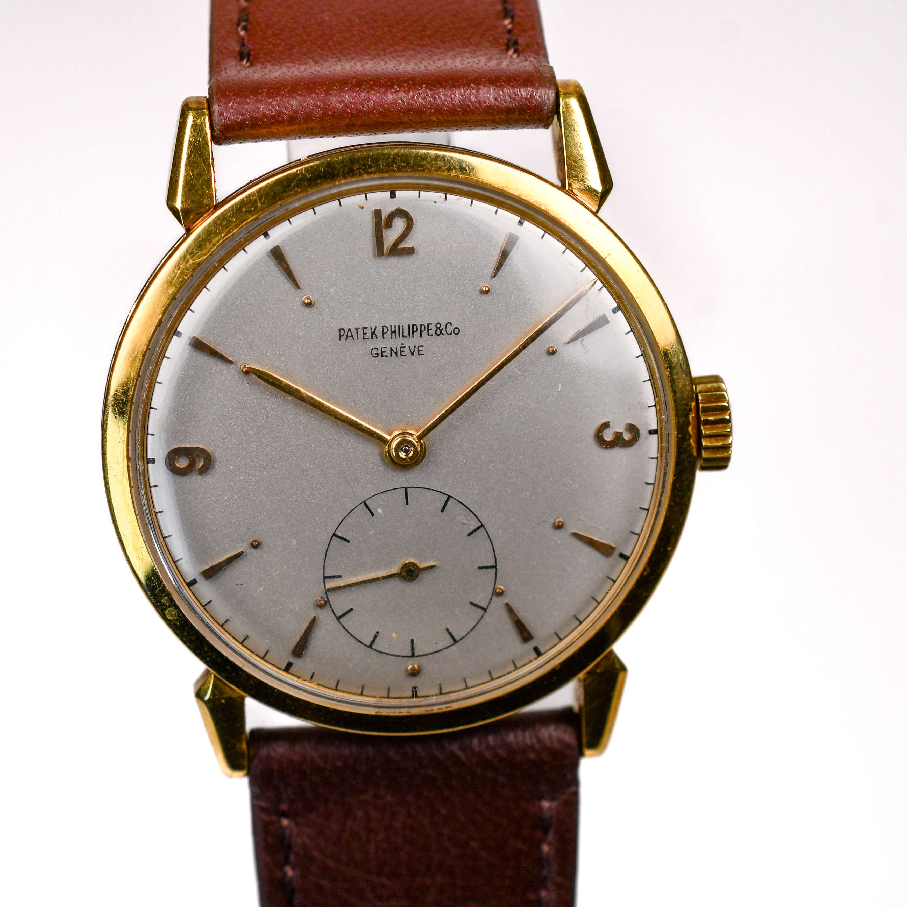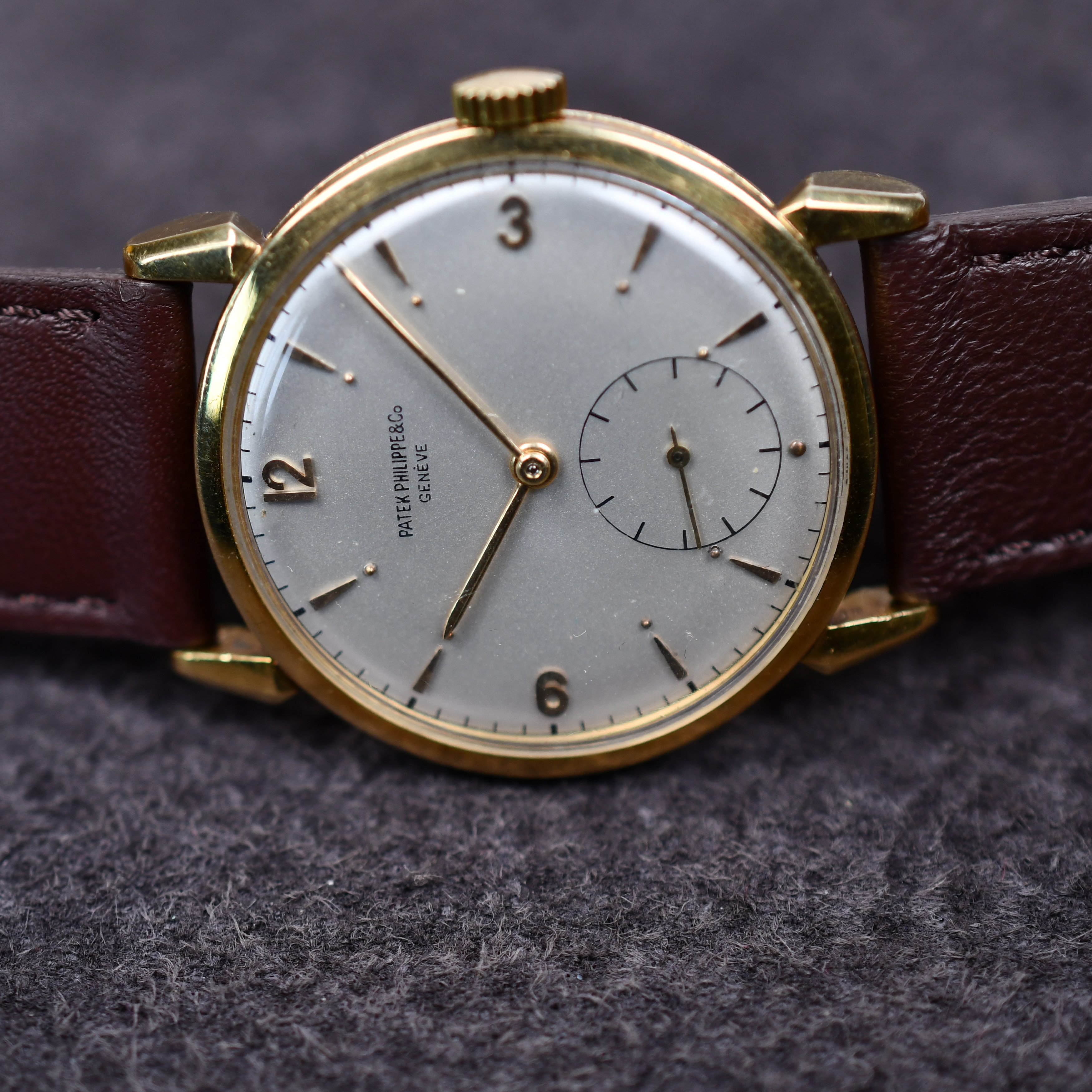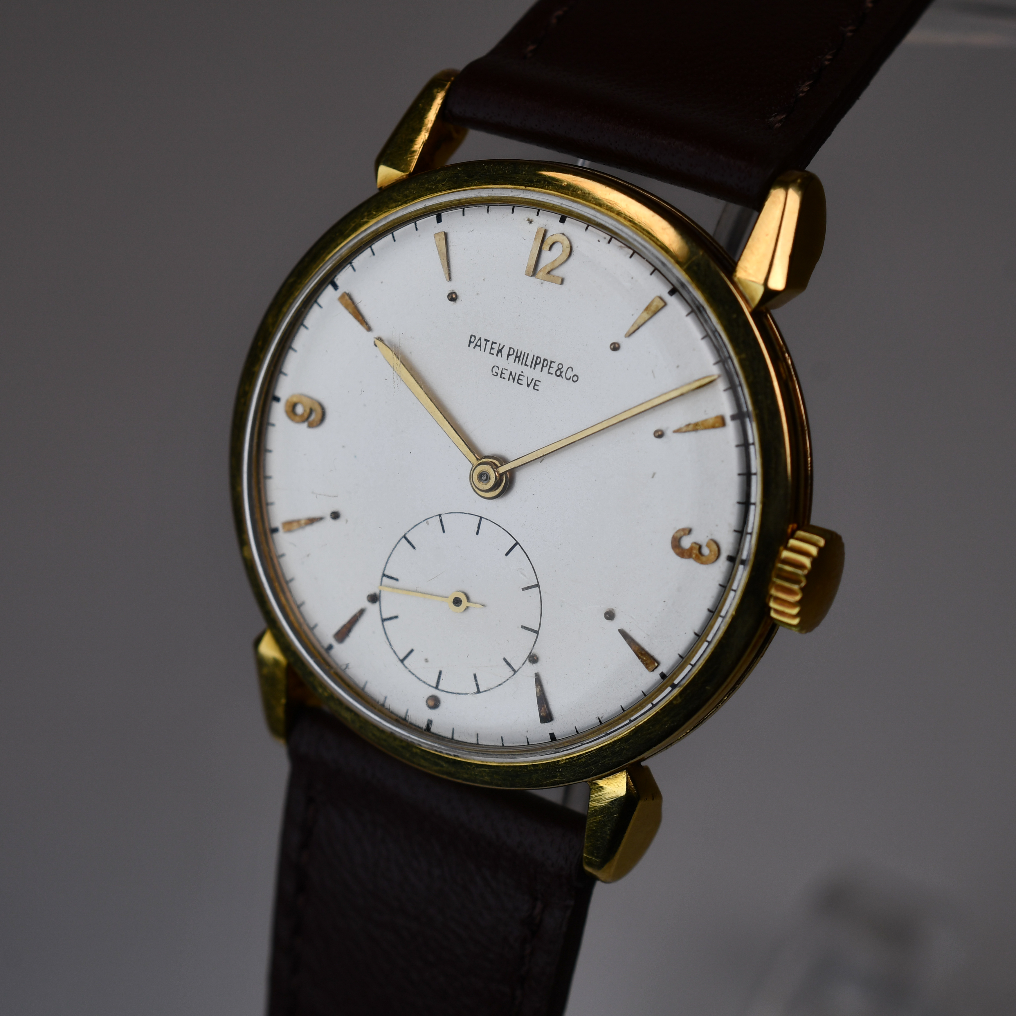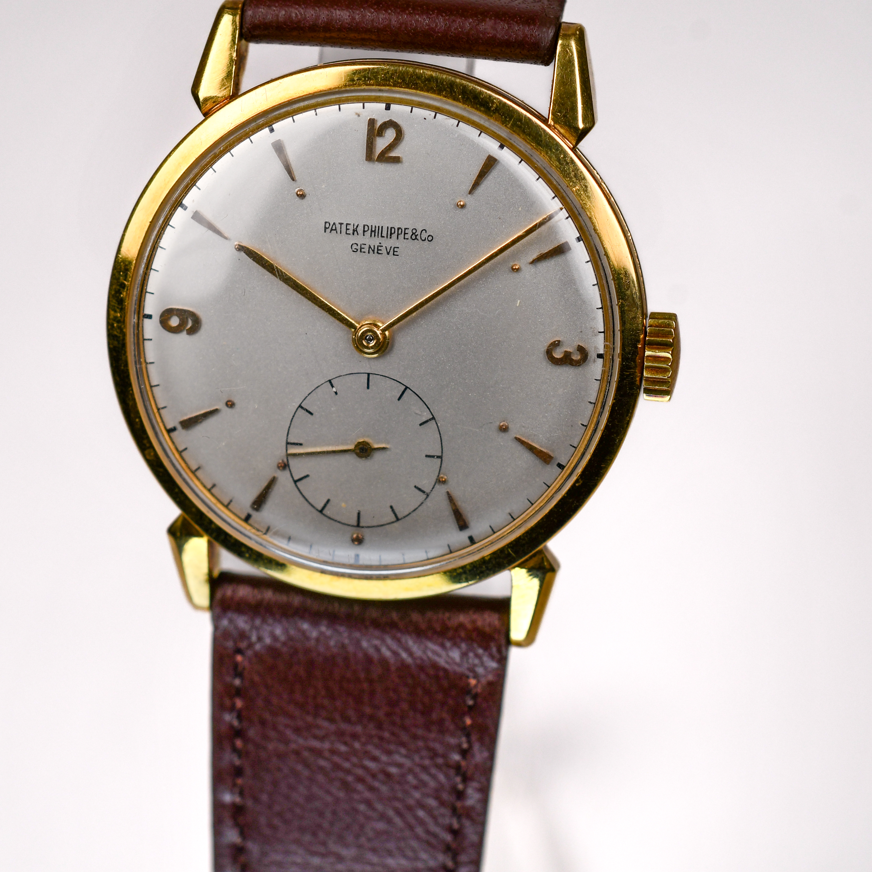 For auction is a Patek Philippe Ref 1578 manual winding 35mm spider lugs yellow gold caliber 12-400 manual winding exclamation dial. The Good: 1. A great case and a great dial. Wegner made case is in overall exceptional condition and the exclamation dial with enamel text is equally great. Maybe the nicest ref. 1578 in the market. 2.Working and functioning correctly, +11 seconds per day and +260 amplitude. 3. The exclamation point dial is among the rarest variation of a 1578 dial and its in a very fine condition. 4. Just an all around terrific oversized Calatrava. The Bad: 1. Watch only.