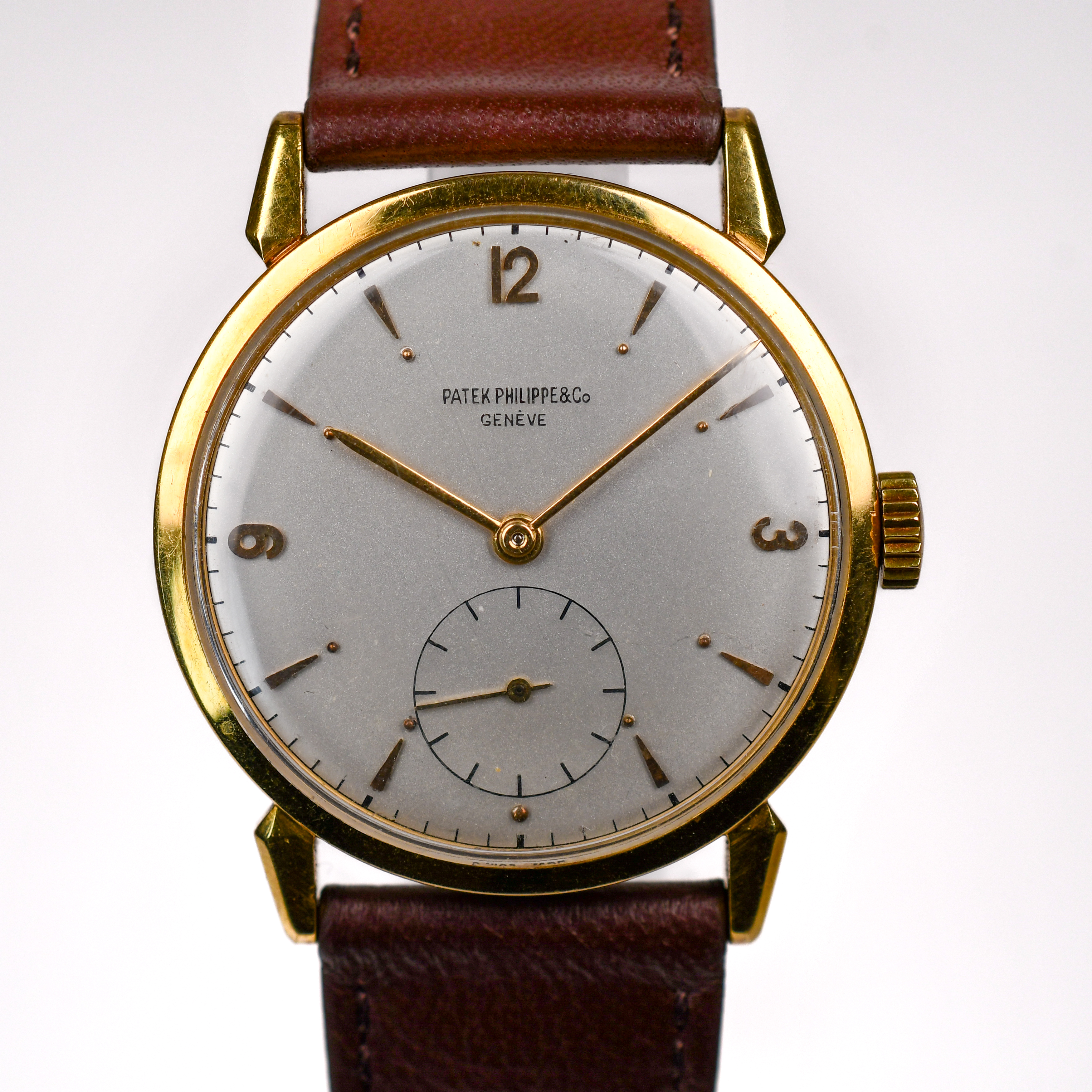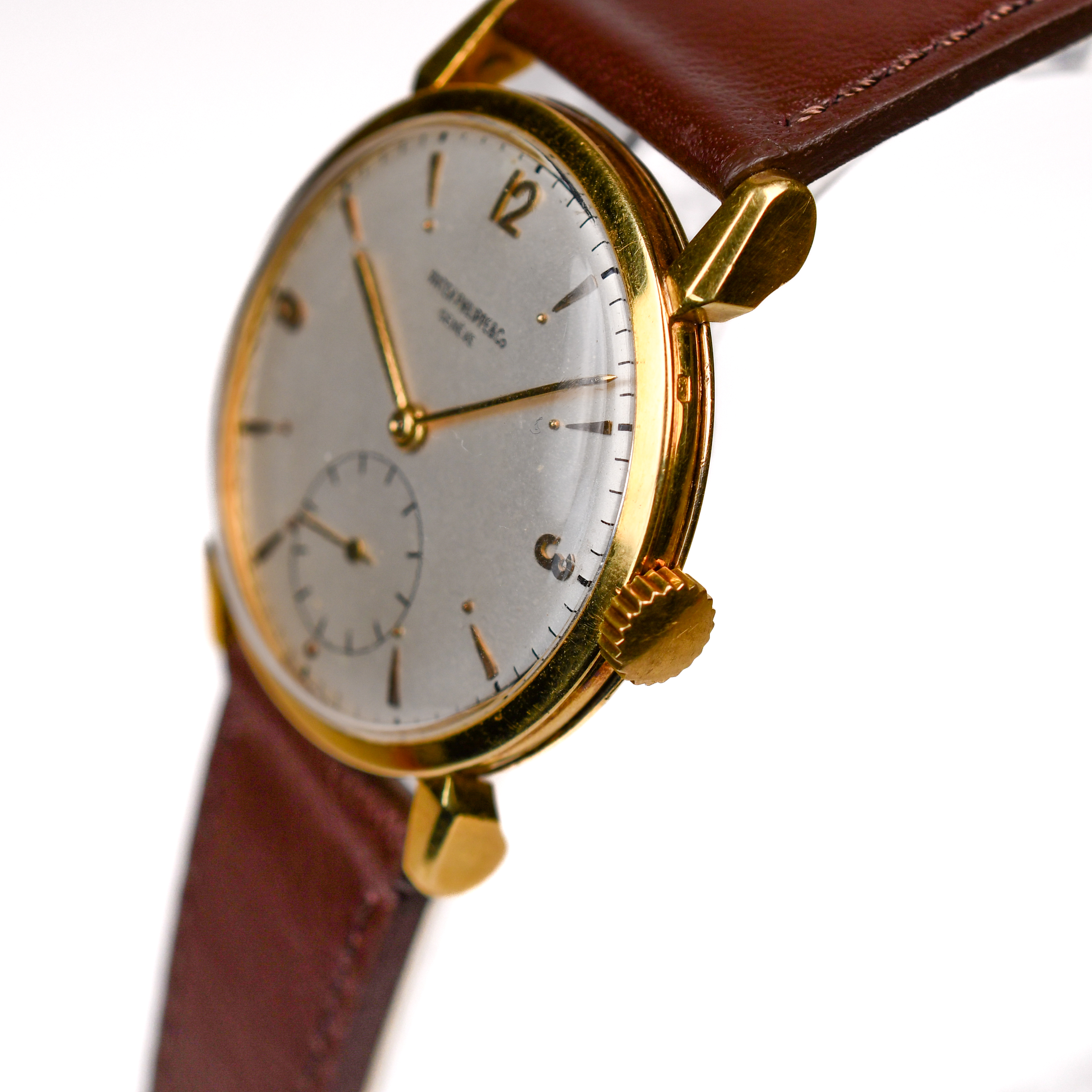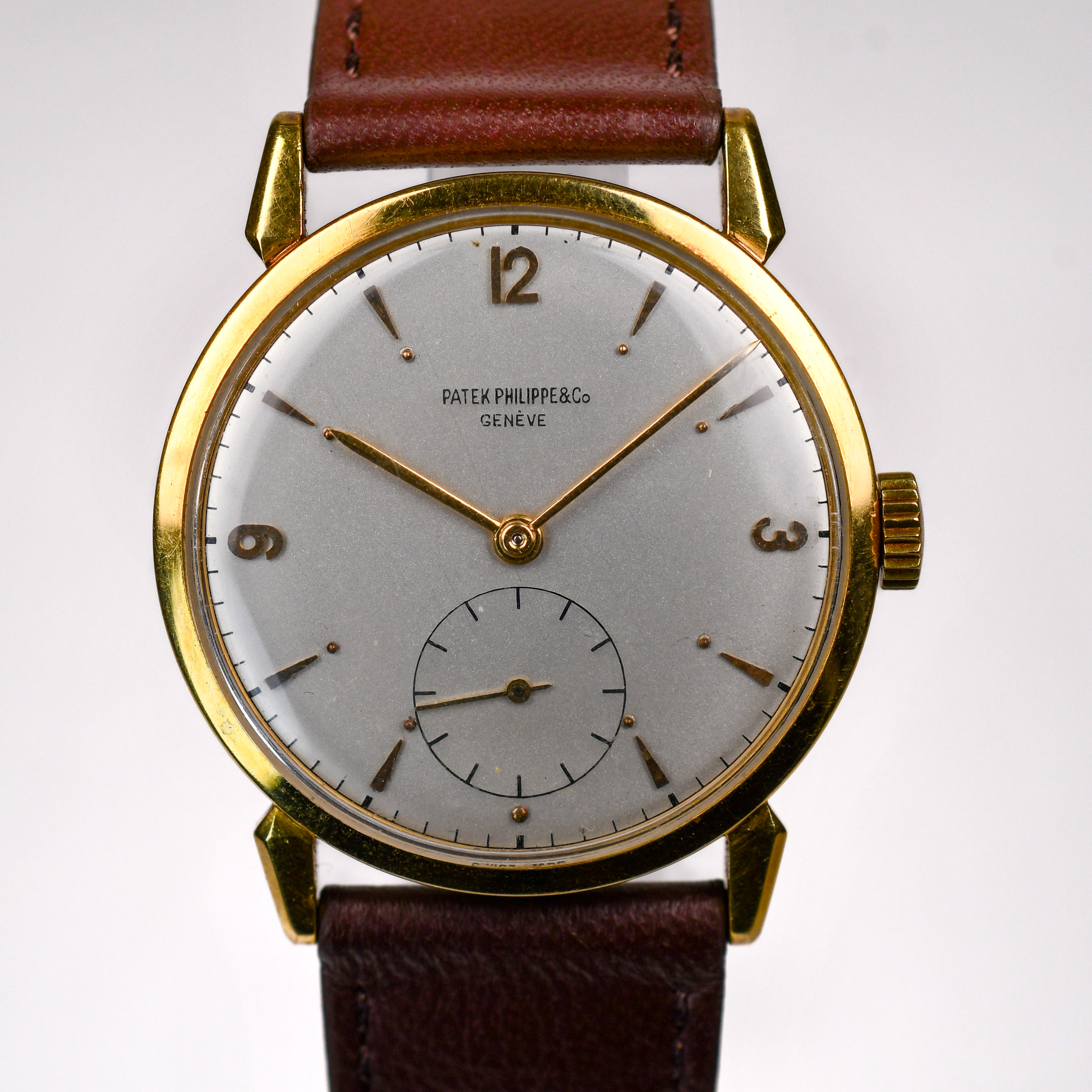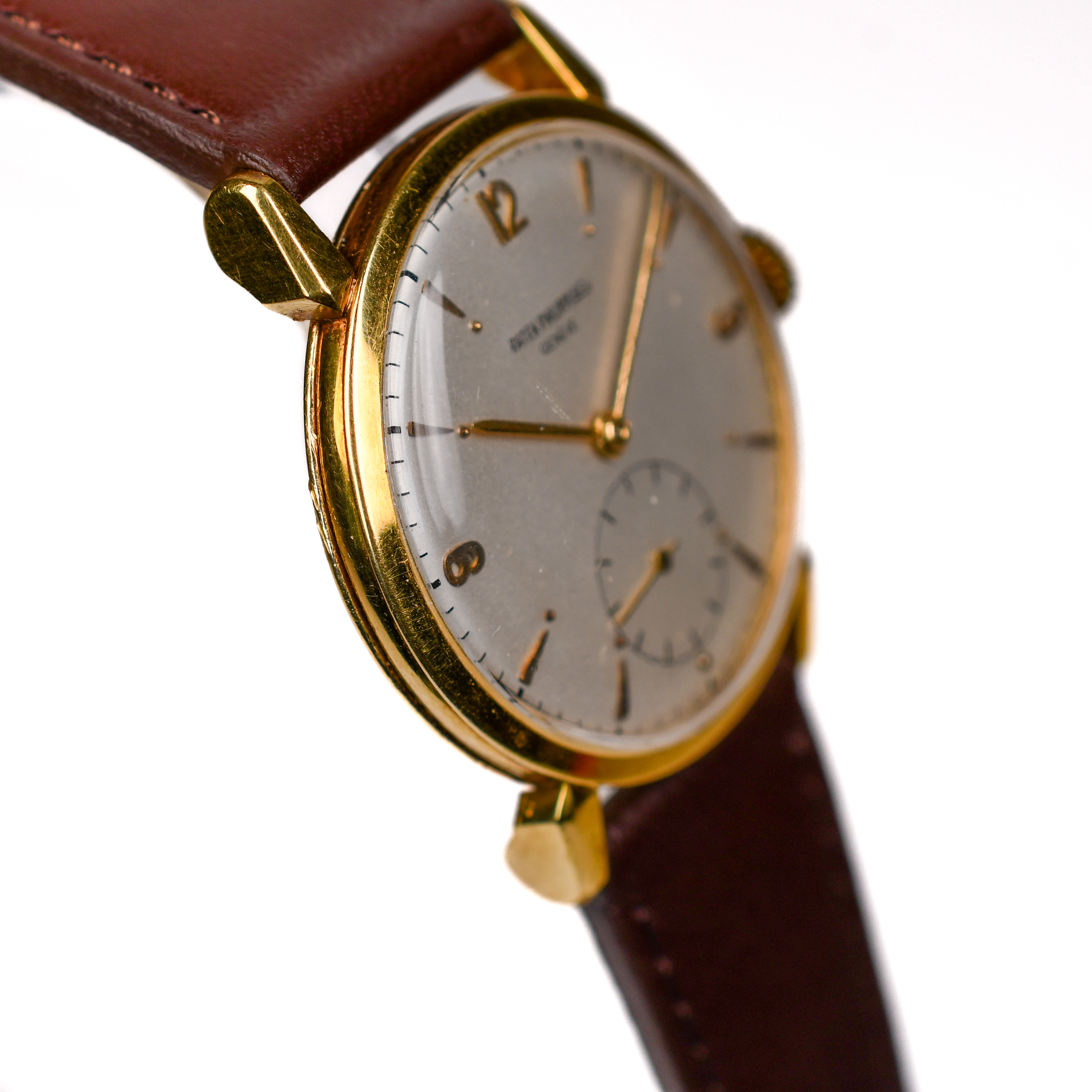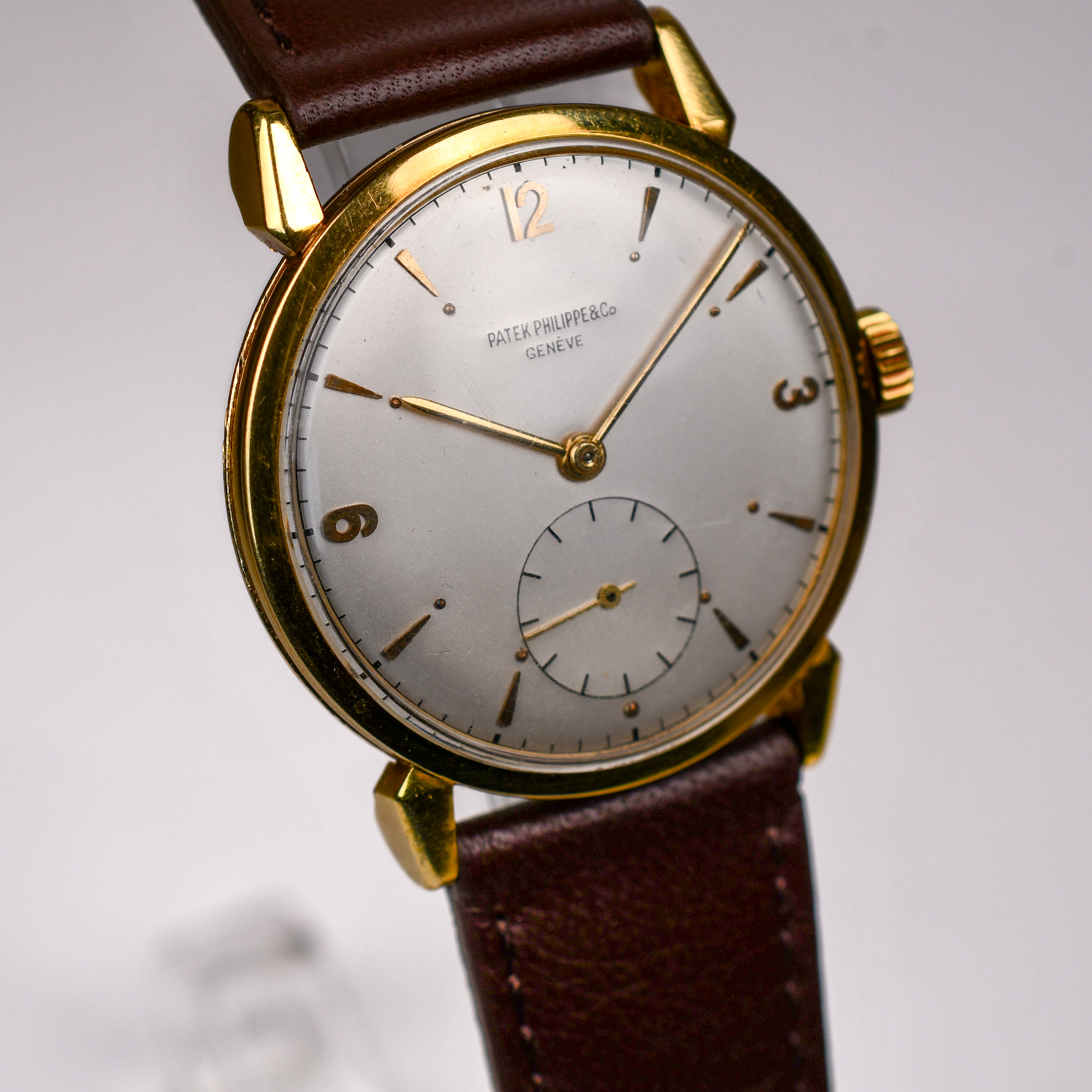 For auction is a Patek Philippe Ref 1578 manual winding 35mm spider lugs yellow gold caliber 12-400 manual winding exclamation dial. The Good: 1. A great case and a great dial. Wegner made case is in overall exceptional condition and the exclamation dial with enamel text is equally great. Maybe the nicest ref. 1578 in the market. 2.Working and functioning correctly, +11 seconds per day and +260 amplitude. 3. The exclamation point dial is among the rarest variation of a 1578 dial and its in a very fine condition. 4. Just an all around terrific oversized Calatrava. The Bad: 1. Watch only.
