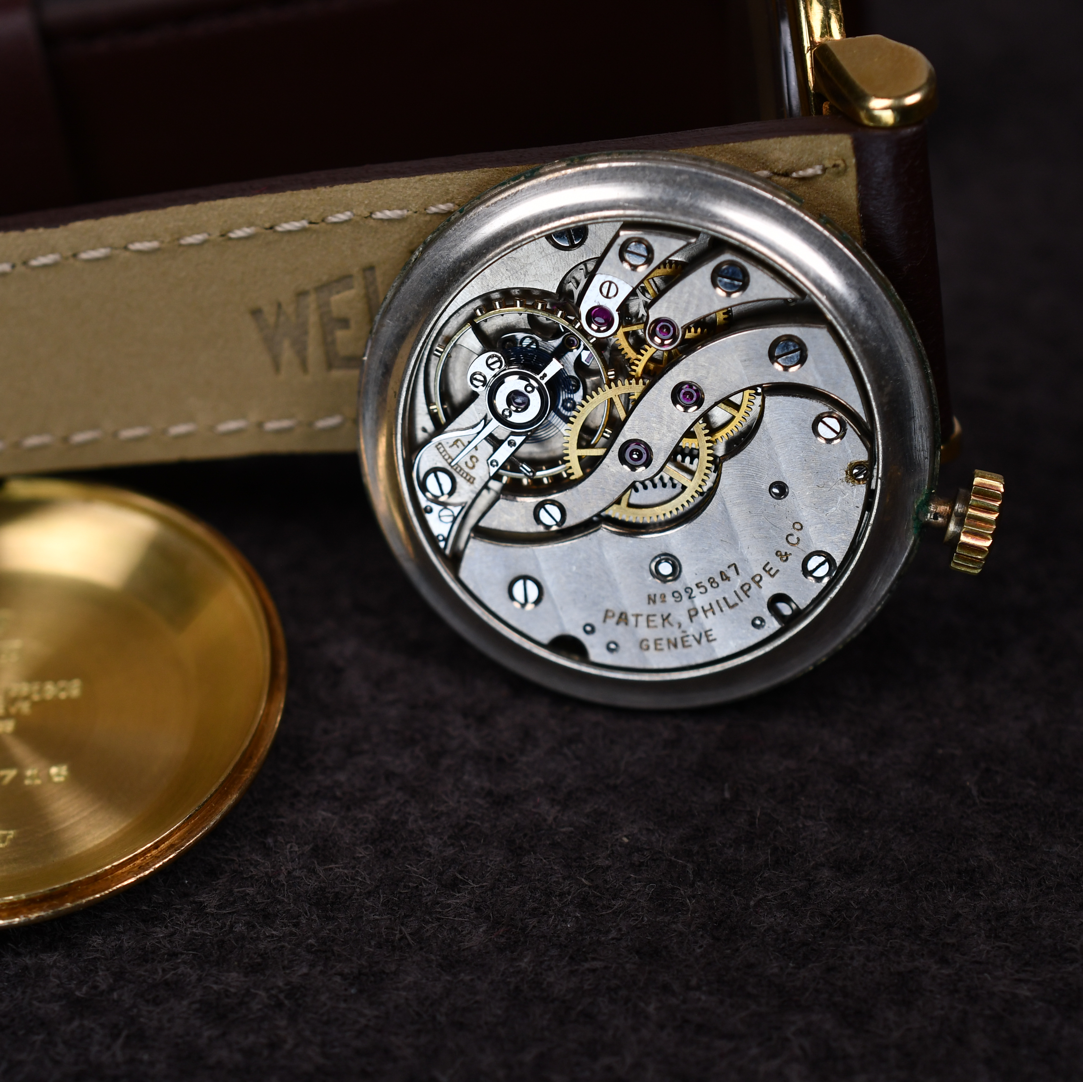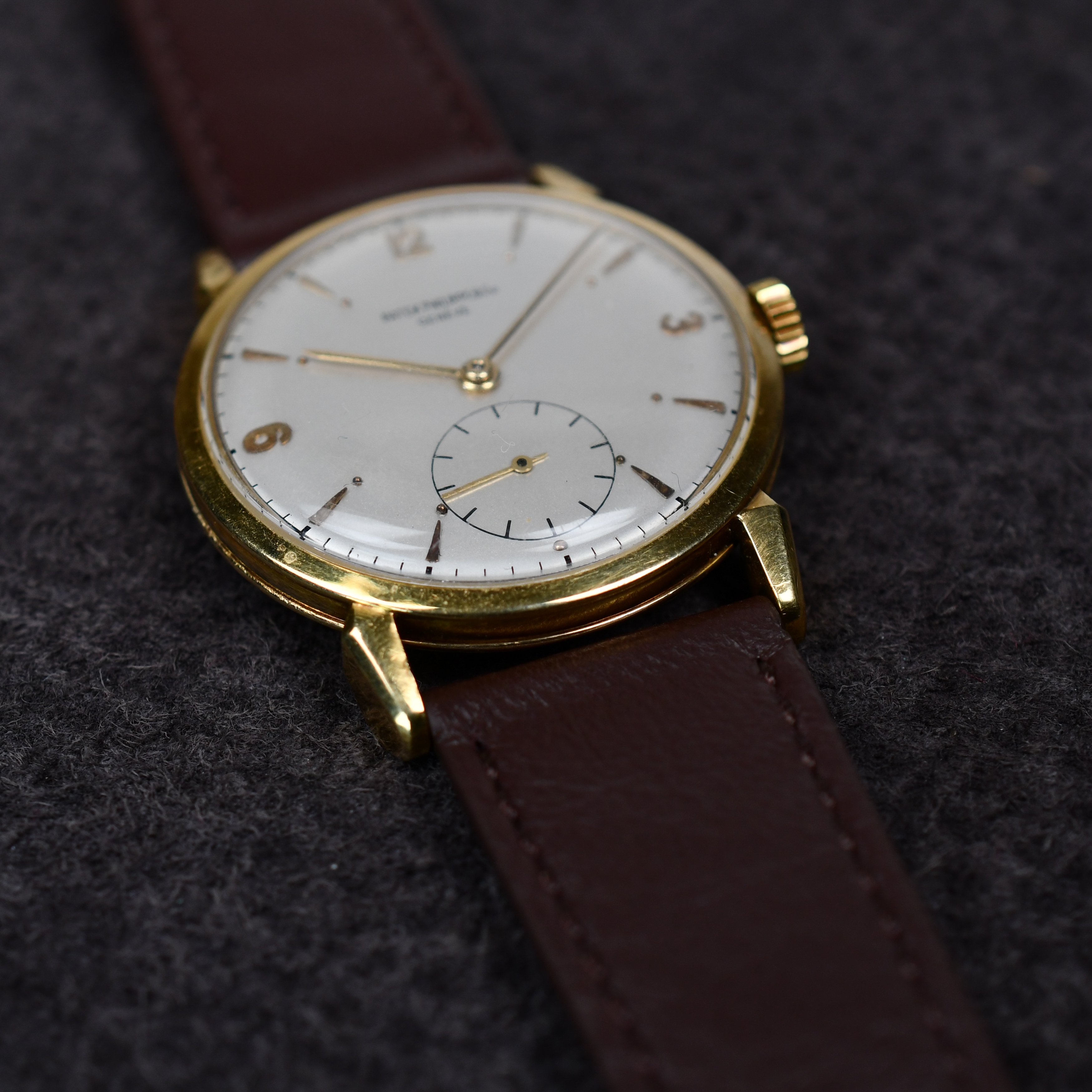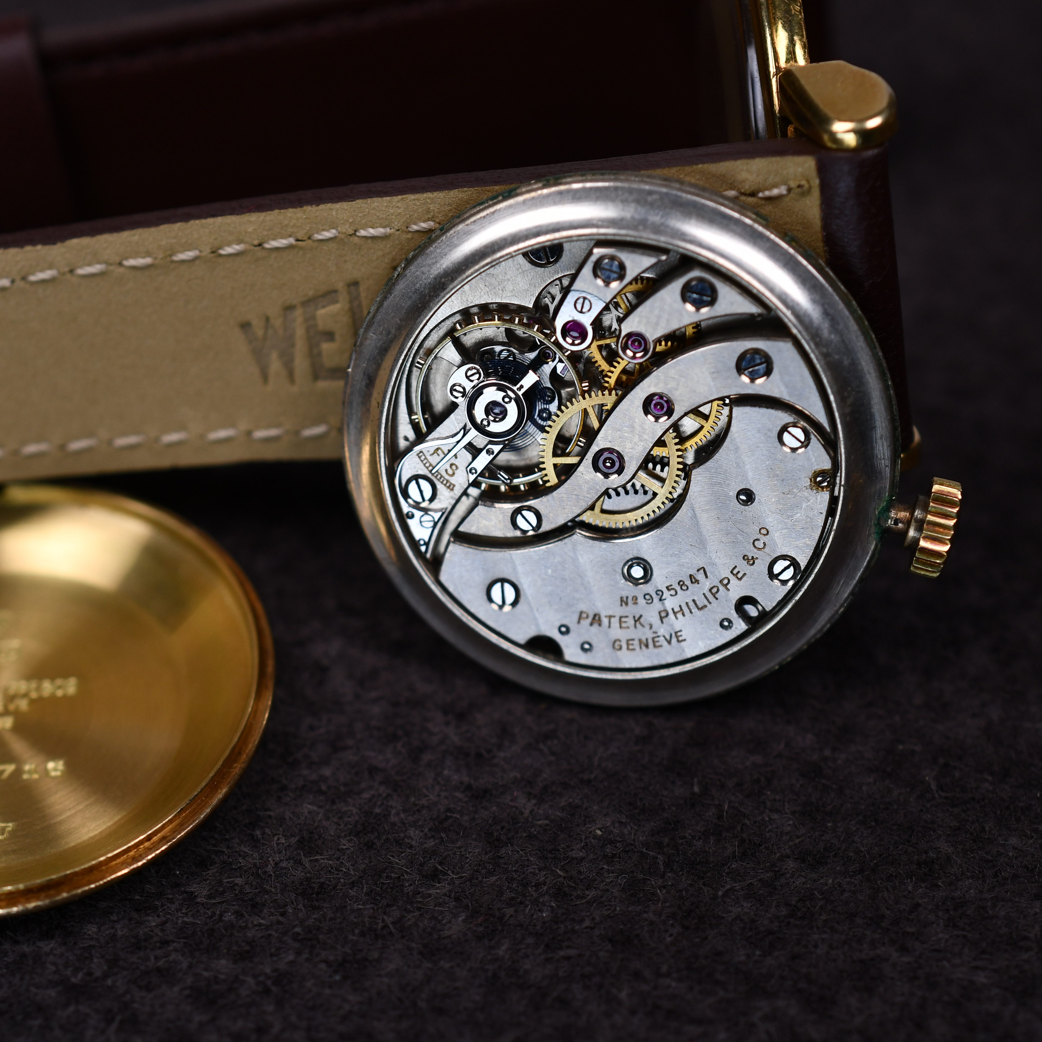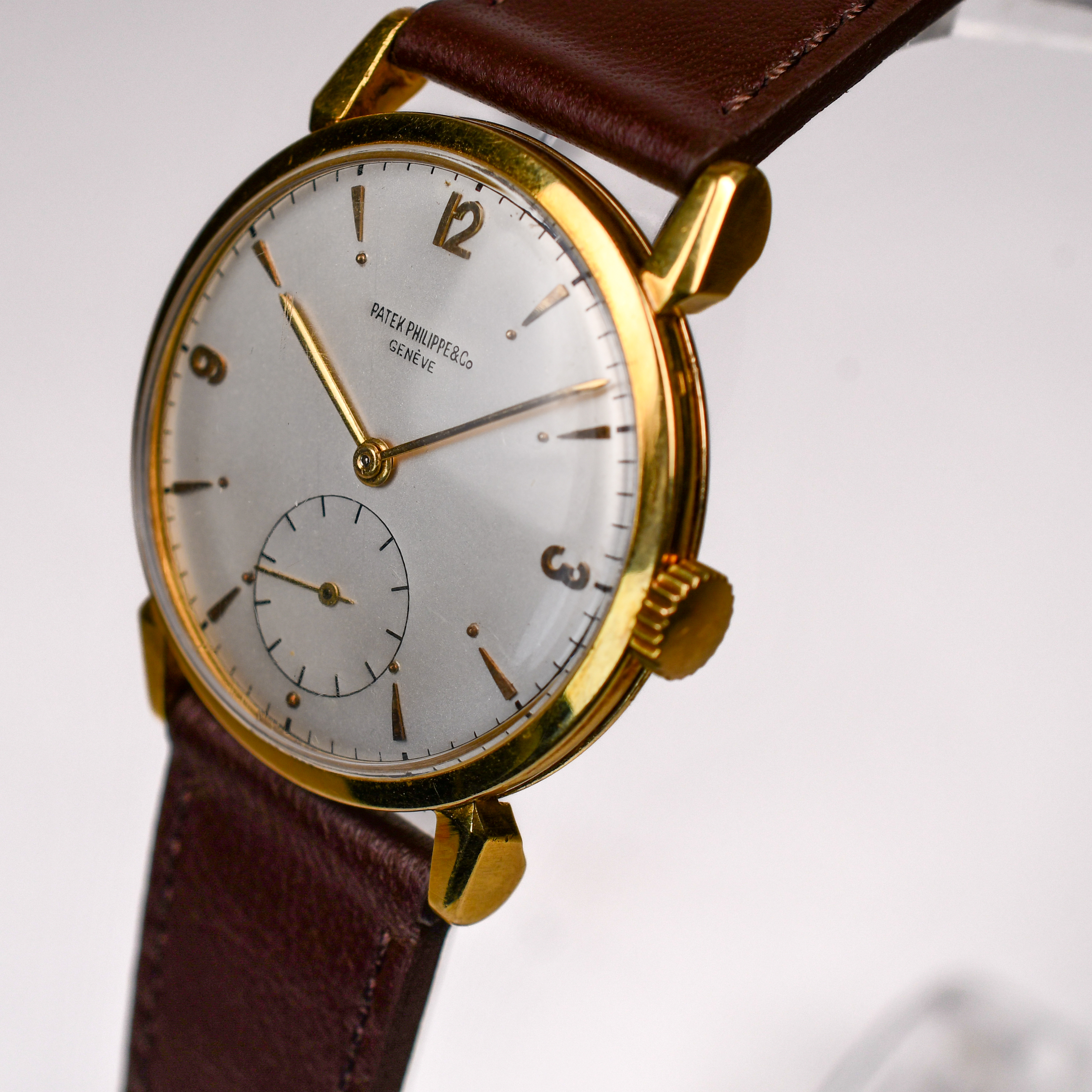 For auction is a Patek Philippe Ref 1578 manual winding 35mm spider lugs yellow gold caliber 12-400 manual winding exclamation dial. The Good: 1. A great case and a great dial. Wegner made case is in overall exceptional condition and the exclamation dial with enamel text is equally great. Maybe the nicest ref. 1578 in the market. 2.Working and functioning correctly, +11 seconds per day and +260 amplitude. 3. The exclamation point dial is among the rarest variation of a 1578 dial and its in a very fine condition. 4. Just an all around terrific oversized Calatrava. The Bad: 1. Watch only.