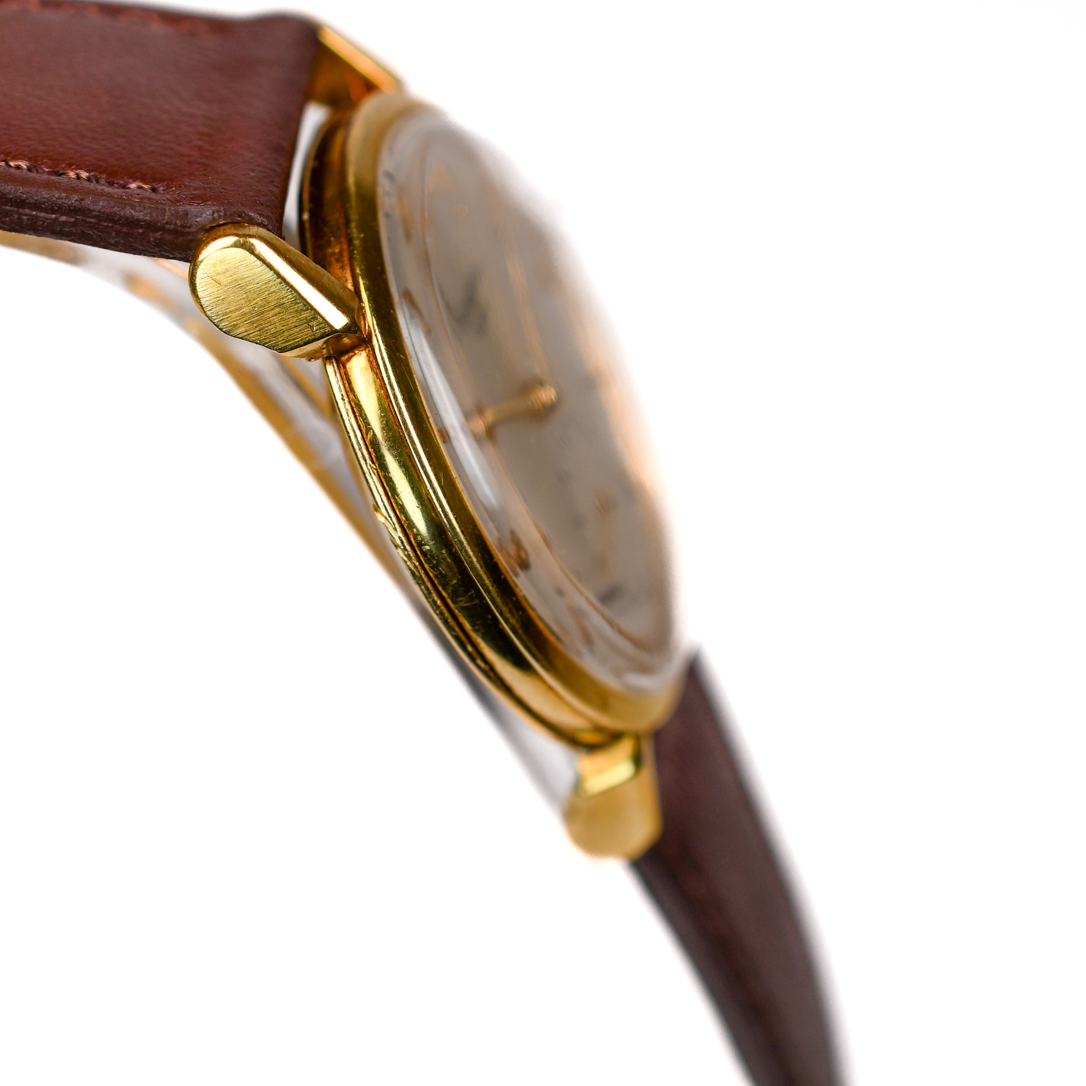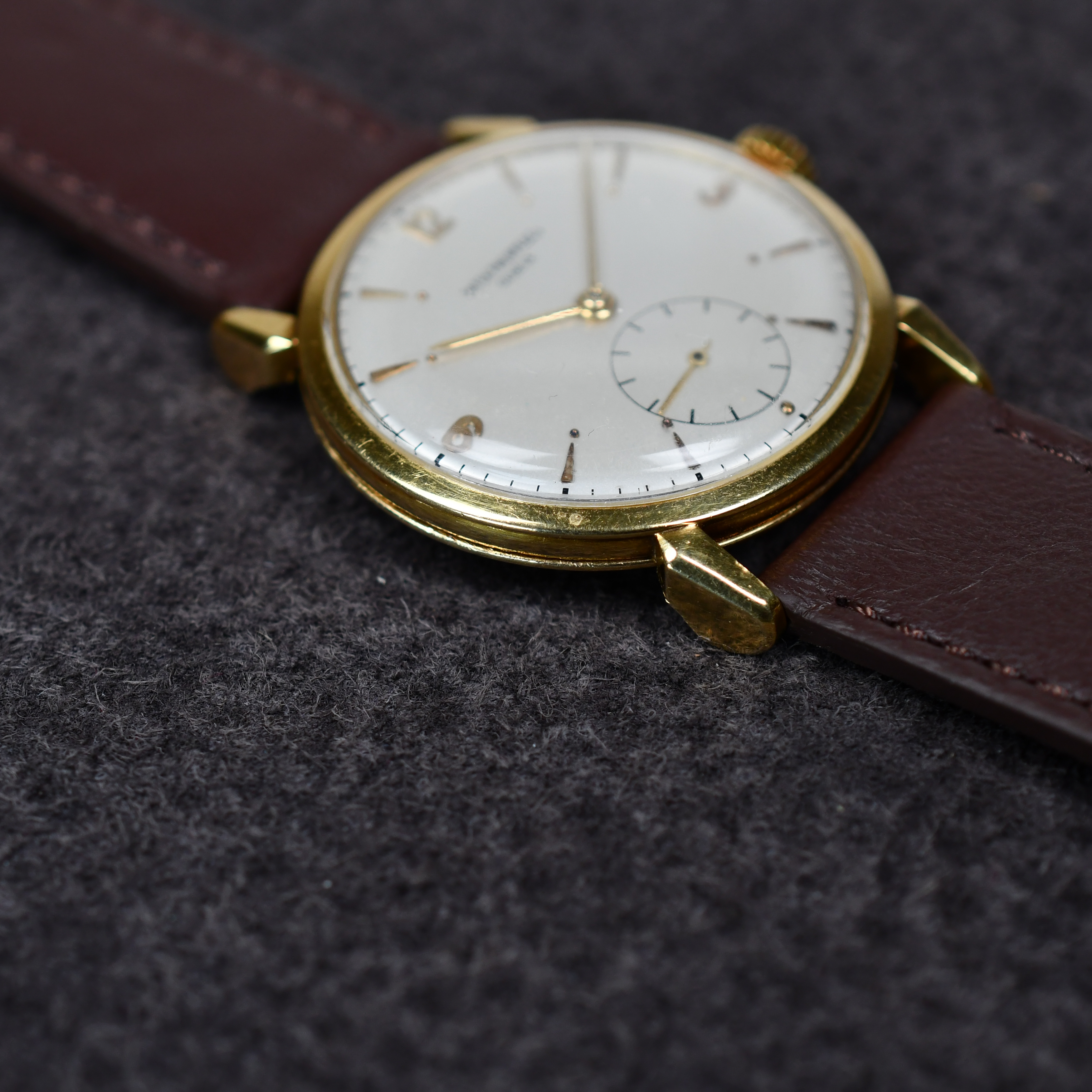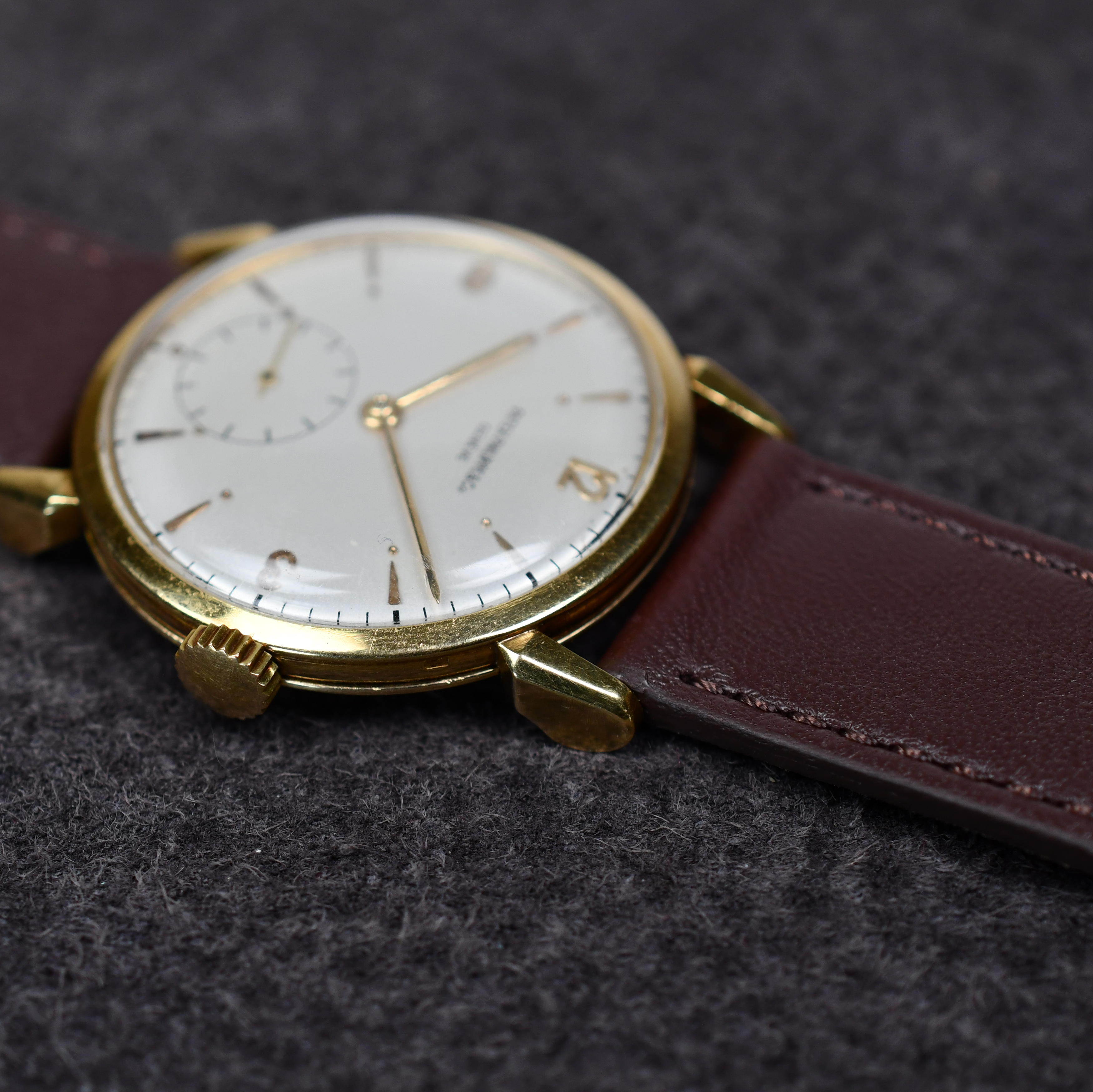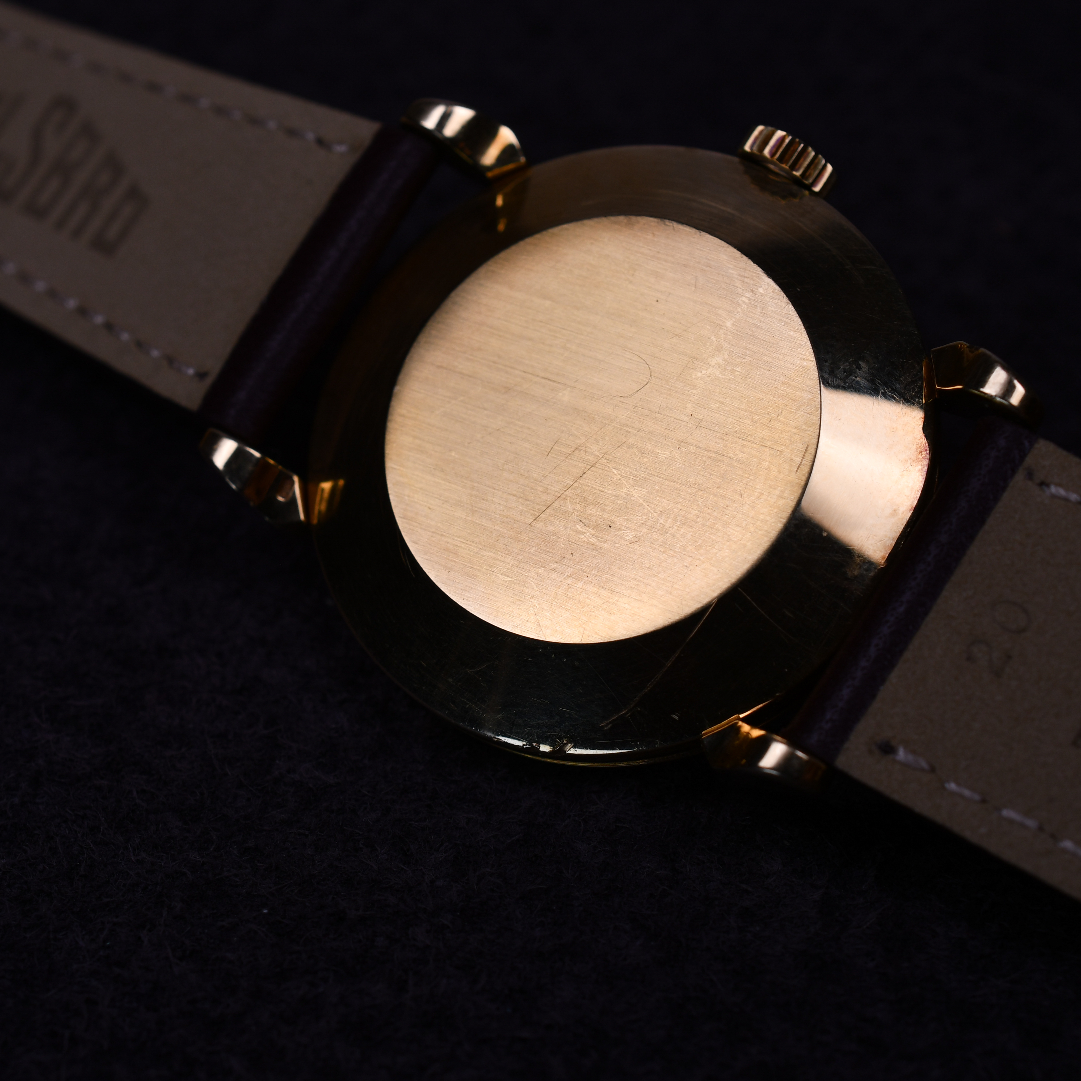 Case: 18k yellow gold with spider lugs, great shape with bevels and hallmarks all sharp, original crown, condition appears never polished