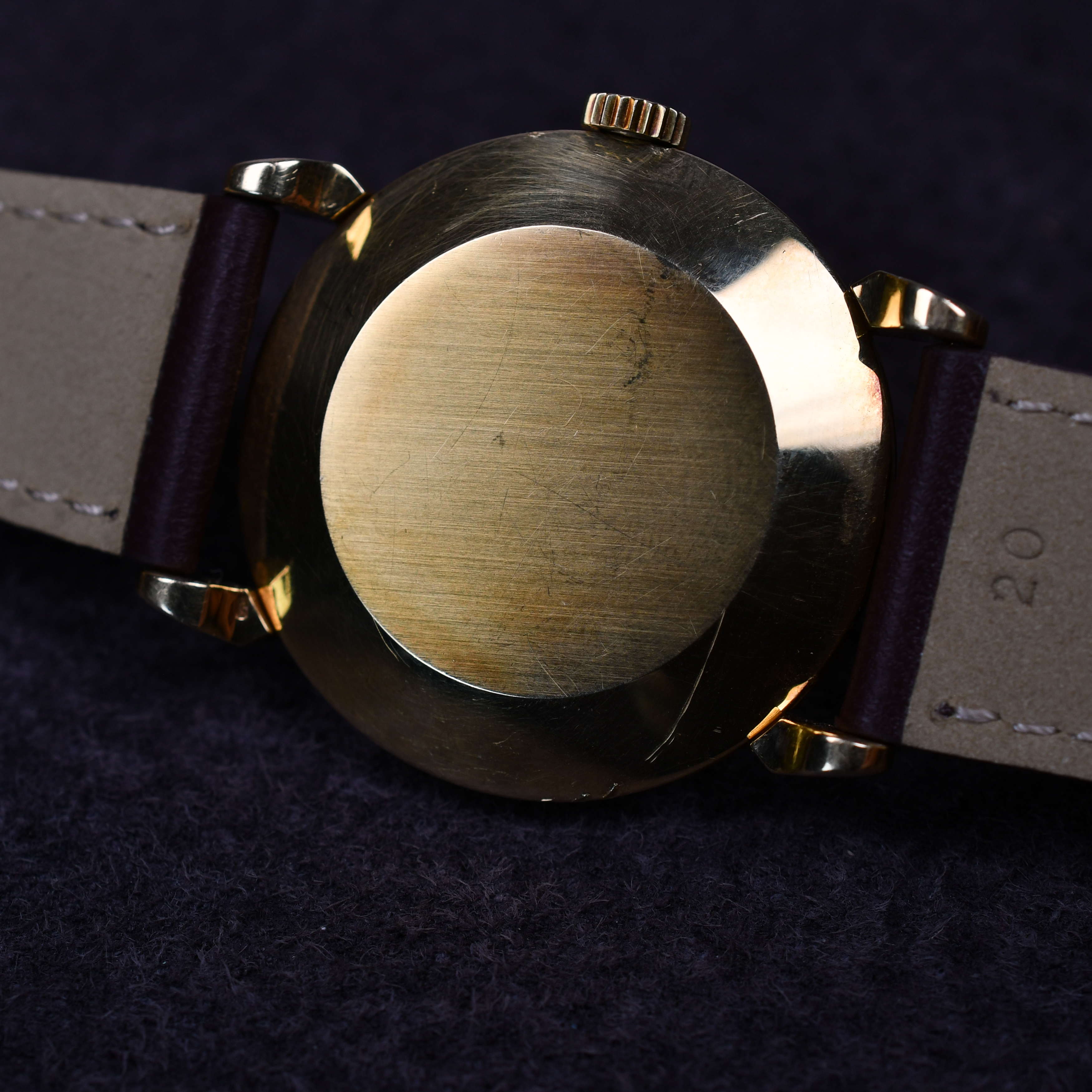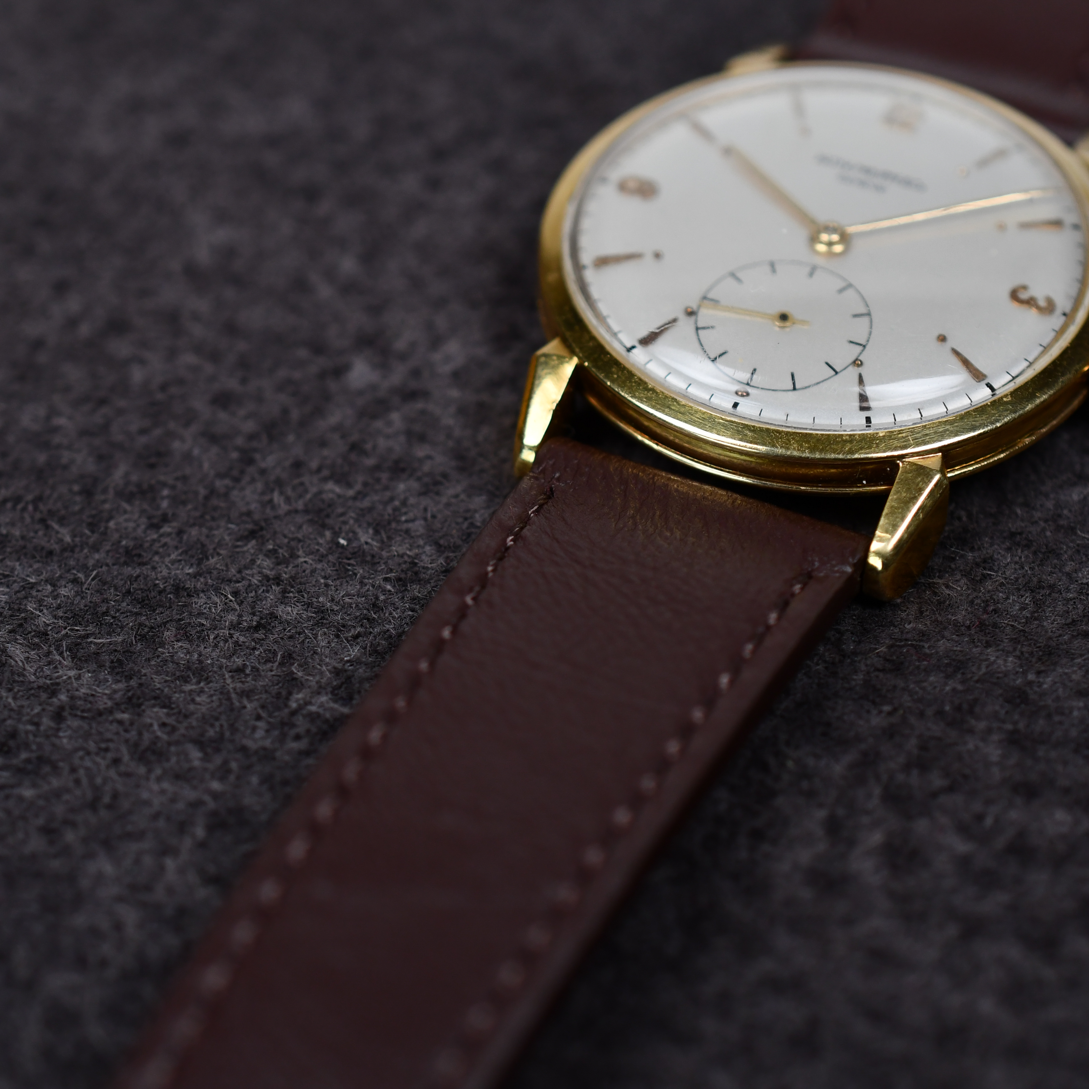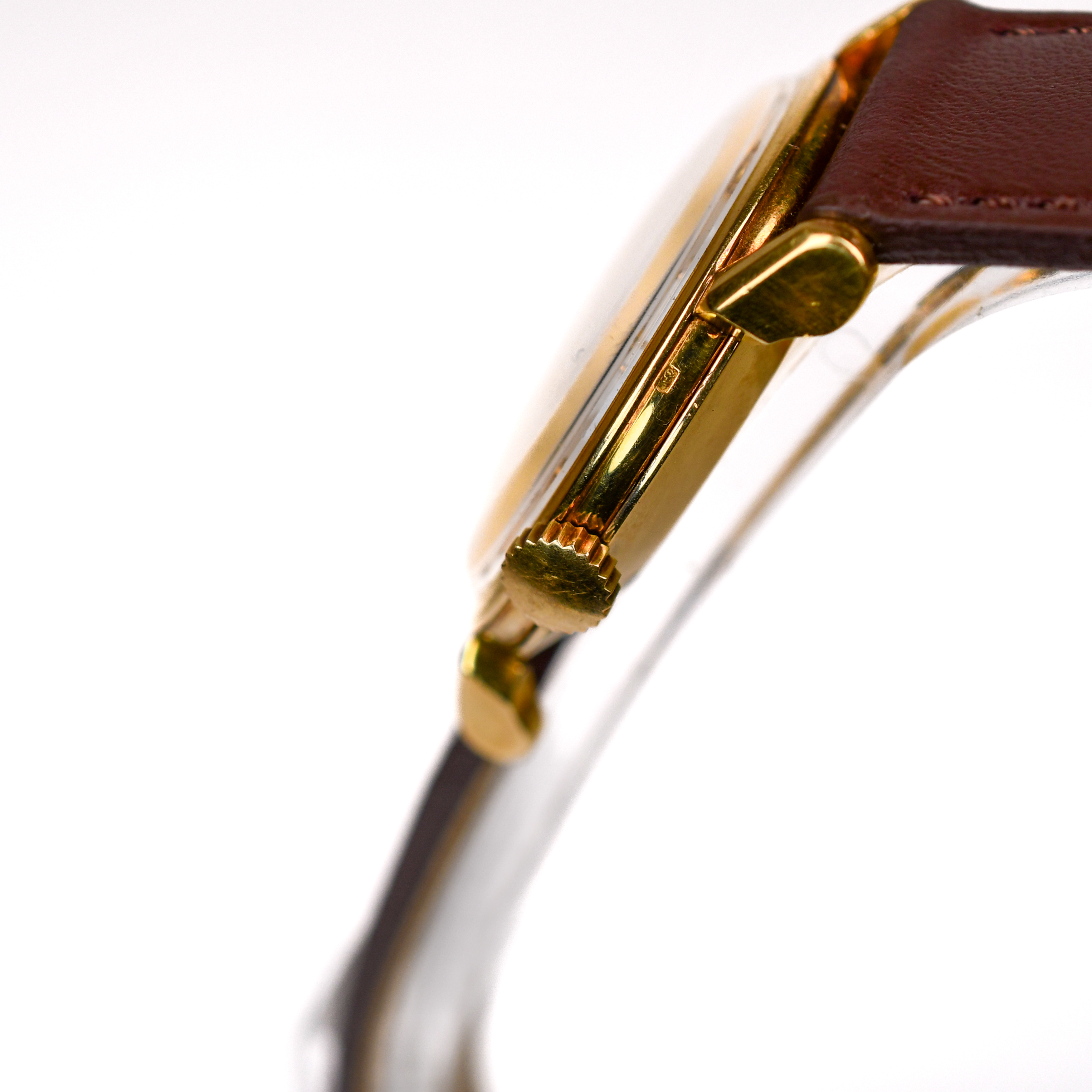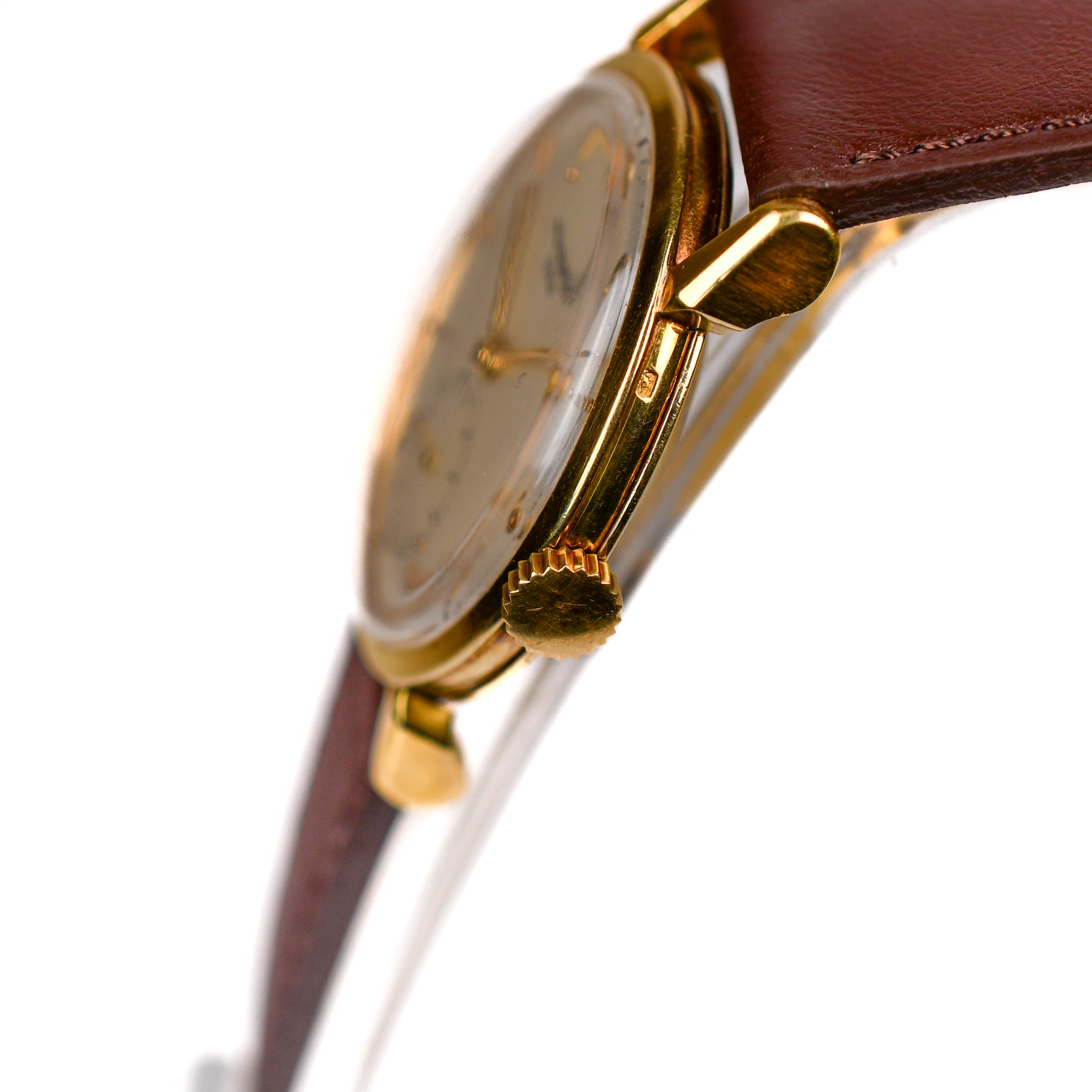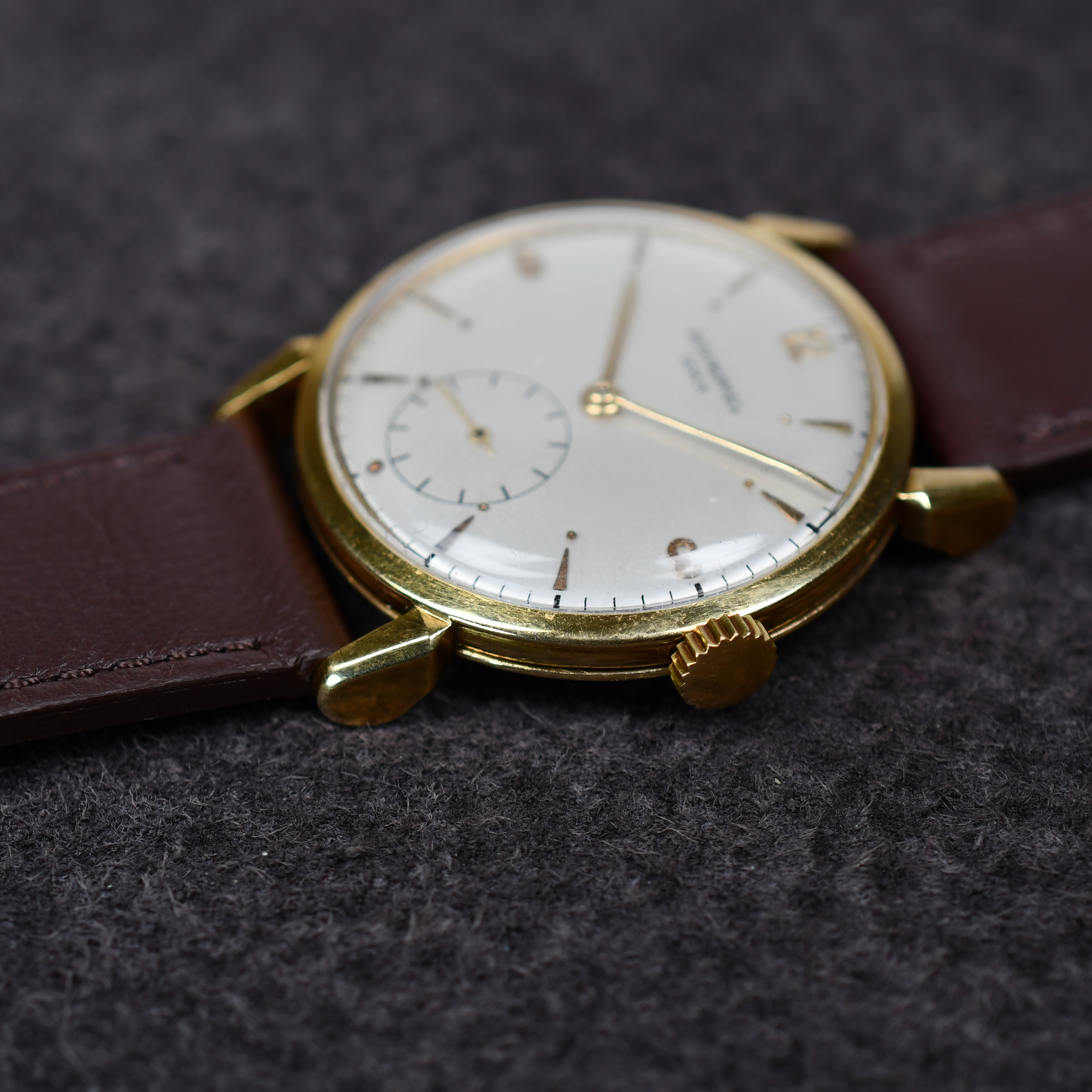 Case: 18k yellow gold with spider lugs, great shape with bevels and hallmarks all sharp, original crown, condition appears never polished