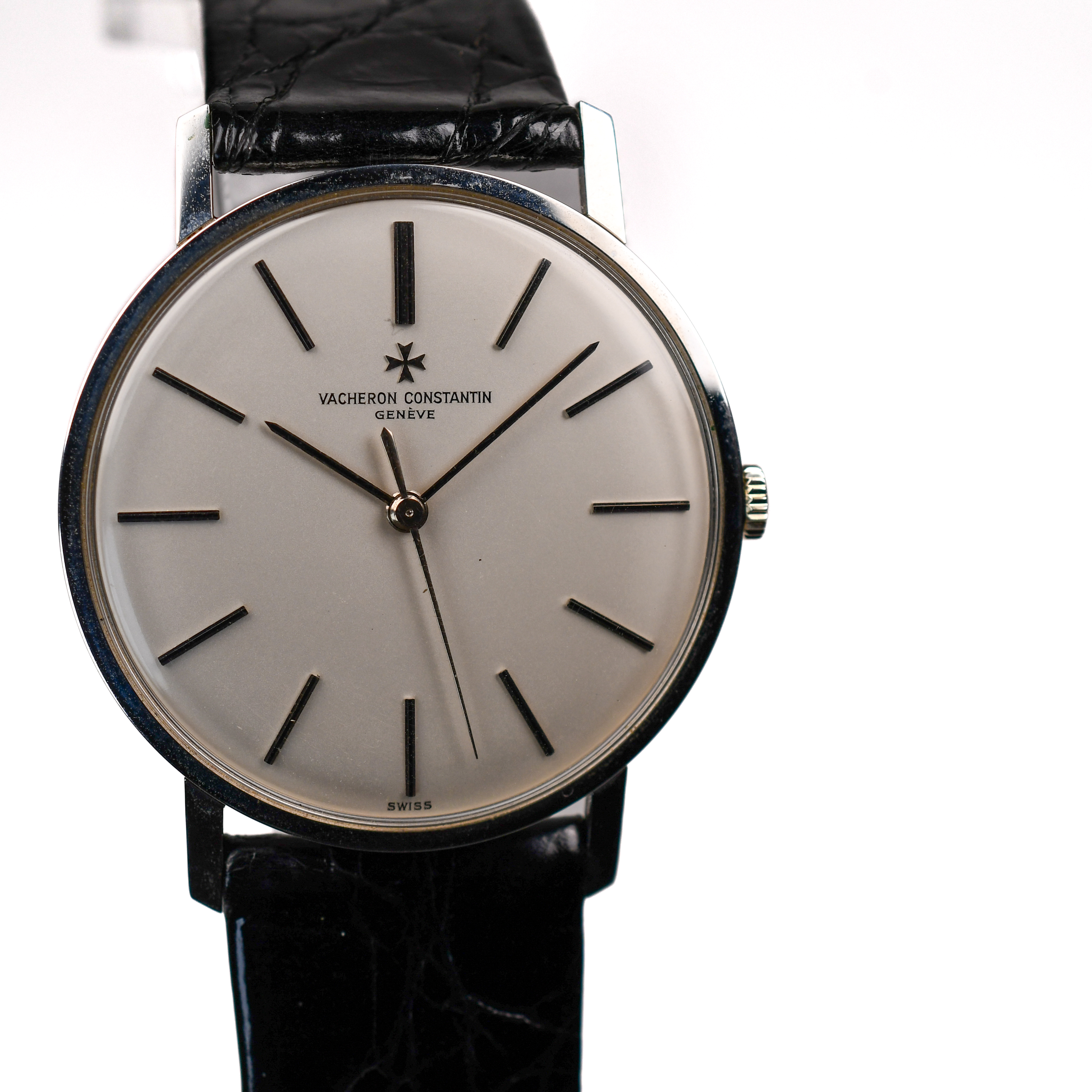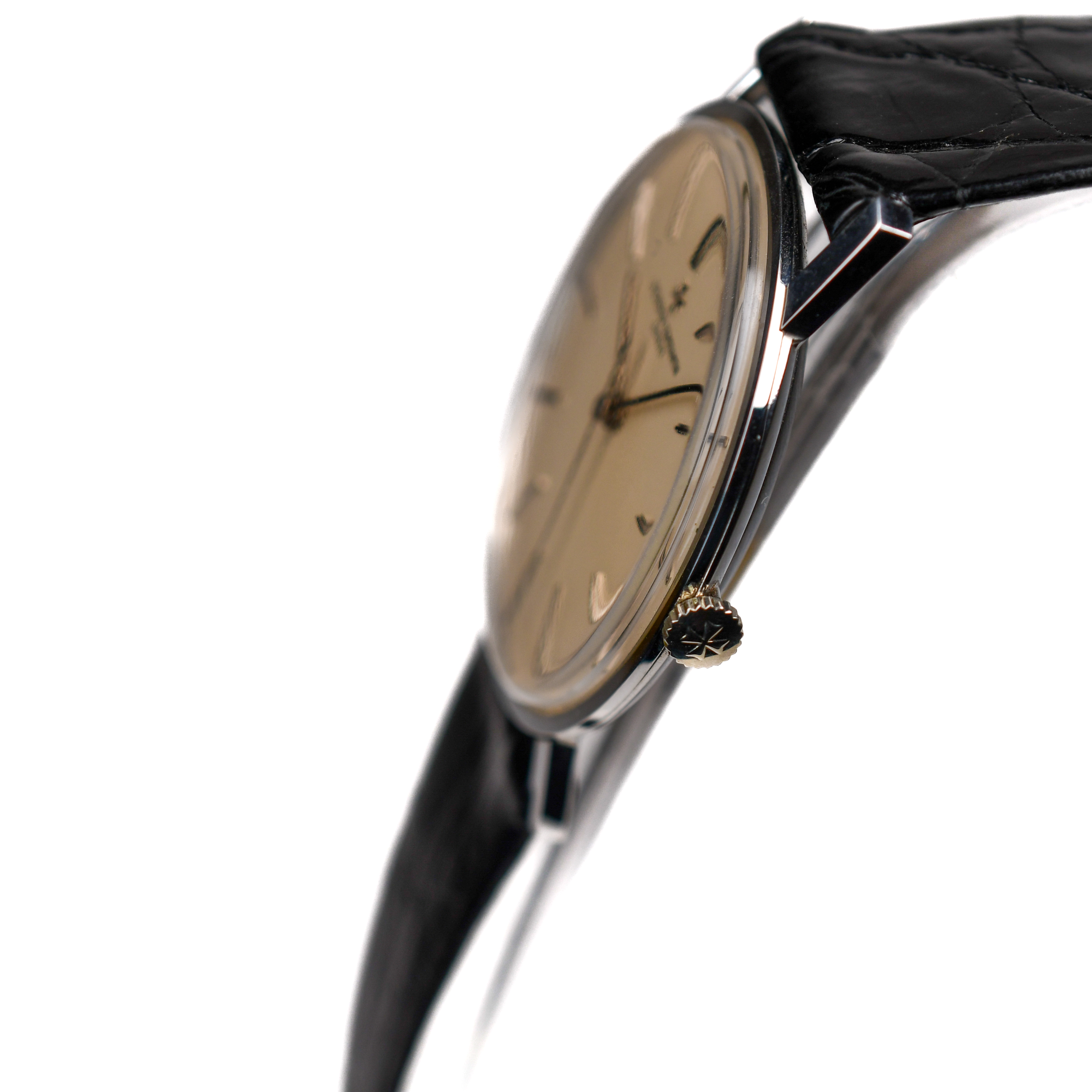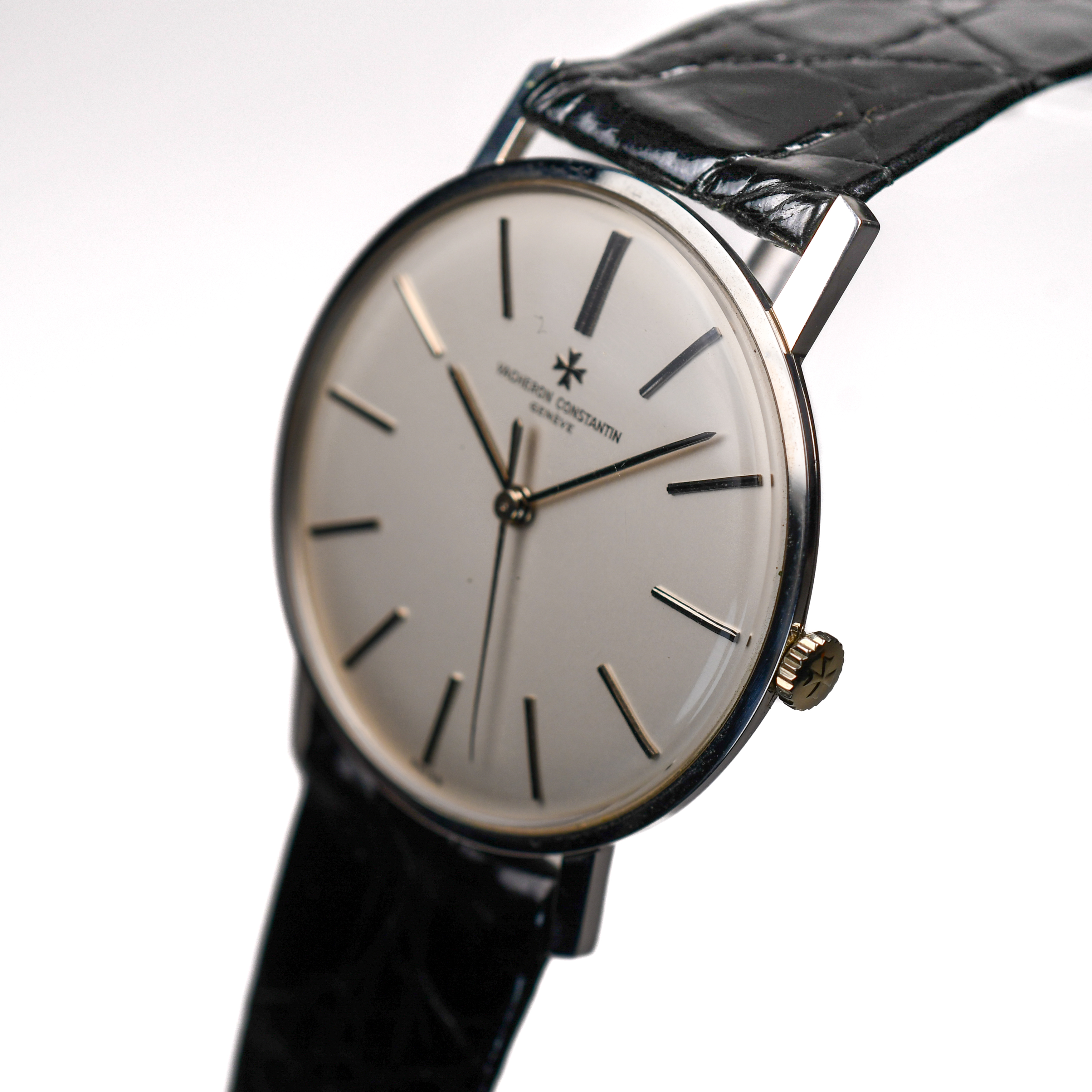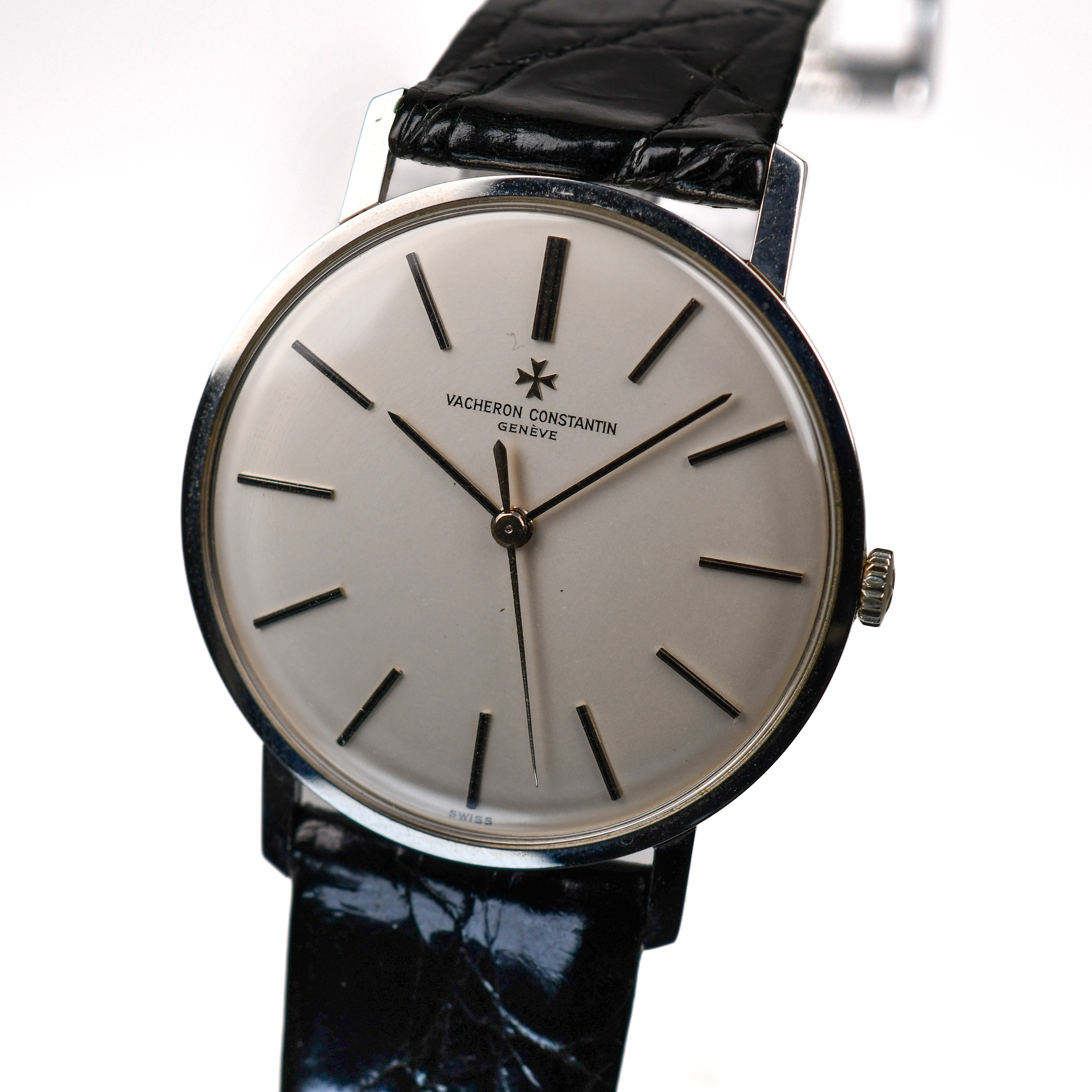 For auction is a 1960's Vacheron Constantin Ref 6563 35mm 3 hands caliber 1002/2 stainless steel condition appears near NOS. The Good: 1. Exceptional condition that feels like new old stock. Unpolished, great original strap and steel tang, perfect dial and case. 2. Large sized steel dress watch with center seconds. 3. Working and functioning correctly, -12 seconds per day and +150. The Bad: 1. Watch only.